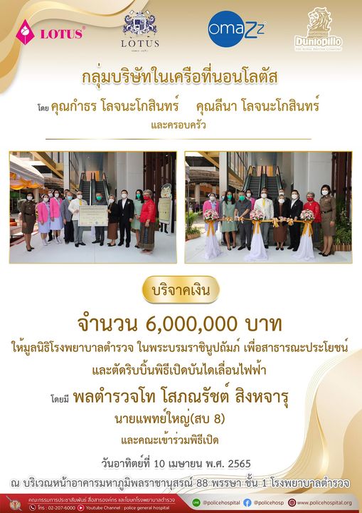 เมื่อวันอาทิตย์ที่ 10 เมษายน พ.ศ. 2565 พลตำรวจโท โสภณรัชต์ สิงหจารุ นายแพทย์ใหญ่(สบ8) ร่วมพิธีเปิด บันไดเลื่อนไฟฟ้า หน้าอาคารมหาภูมิพลราชานุสรณ์ 88 พรรษา ซึ่งกลุ่มบริษัทในเครือที่นอนโลตัส โดย คุณกำธร โลจนะโกสินทร์ คุณลีนา โลจนะโกสินทร์ และคณะ บริจาคเงิน 6,000,000 บาท ให้มูลนิธิโรงพยาบาลตำรวจ ในพระบรมราชินูปถัมภ์ เพื่อสาธารณะประโยชน์ ณ บริเวณหน้าอาคารมหาภูมิพลราชานุสรณ์ 88 พรรษา ชั้น 1 โรงพยาบาลตำรวจ