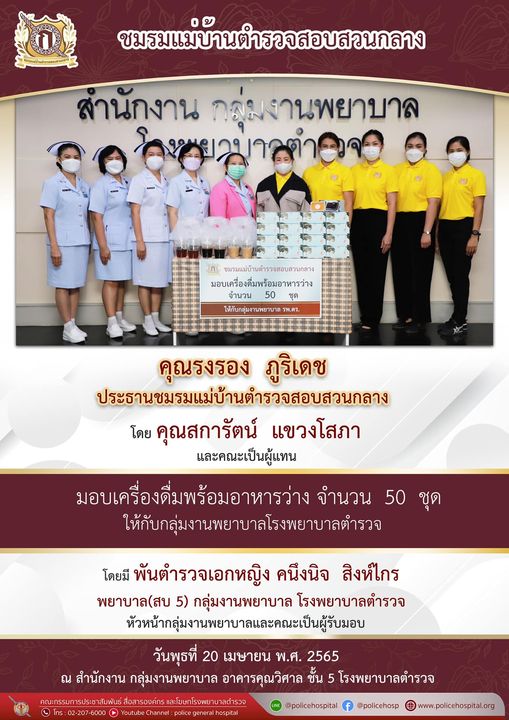 เมื่อวันพุธที่ 20 เมษายน พ.ศ. 2565 ชมรมแม่บ้านตำรวจสอบสวนกลาง คุณรงรอง ภูริเดช ประธานชมรมแม่บ้านตำรวจสอบสวนกลาง โดยคุณสการัตน์ แขวงโสภา และคณะเป็นผู้แทนมอบ เครื่องดื่มพร้อมอาหารว่าง จำนวน 50 ชุด ให้กลุ่มงานพยาบาล โรงพยาบาลตำรวจ โดยมี พันตำรวจเอกหญิง คนึงนิจ สิงห์ไกร พยาบาล(สบ 5) กลุ่มงานพยาบาล โรงพยาบาลตำรวจ หัวหน้ากลุ่มงานพยาบาล และคณะเป็นผู้แทนรับมอบ ณ สำนักงานกลุ่มงานพยาบาล อาคารคุณวิศาล ชั้น 5 โรงพยาบาลตำรวจ