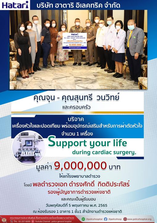 เมื่อวันพฤหัสบดีที่ 5 พฤษภาคม พ.ศ. 2565 พลตำรวจเอก ดำรงศักดิ์ กิตติประภัสร์ รองผู้บัญชาการตำรวจแห่งชาติ พลตำรวจเอก ปิยะ อุทาโย รองผู้บัญชาการตำรวจแห่งชาติ พลตำรวจโท กิตติ์รัฐ พันธุ์เพ็ชร์ ผู้ช่วยผู้บัญชาการตำรวจแห่งชาติ พลตำรวจโท โสภณรัชต์ สิงหจารุ นายแพทย์ใหญ่(สบ8) และคณะ ร่วมพิธีรับมอบ เครื่องหัวใจและปอดเทียม พร้อมอุปกรณ์เสริมสำหรับการผ่าตัดหัวใจ จำนวน 1 เครื่อง มูลค่า 9,000,000 บาท จากบริษัท ฮาตาริ อิเลคทริค จำกัด โดยคุณจุน - คุณสุนทรี วนวิทย์ และครอบครัว แก่โรงพยาบาลตำรวจ ณ ห้องรับรอง อาคาร 1 ชั้น 1 สำนักงานตำรวจแห่งชาติ
