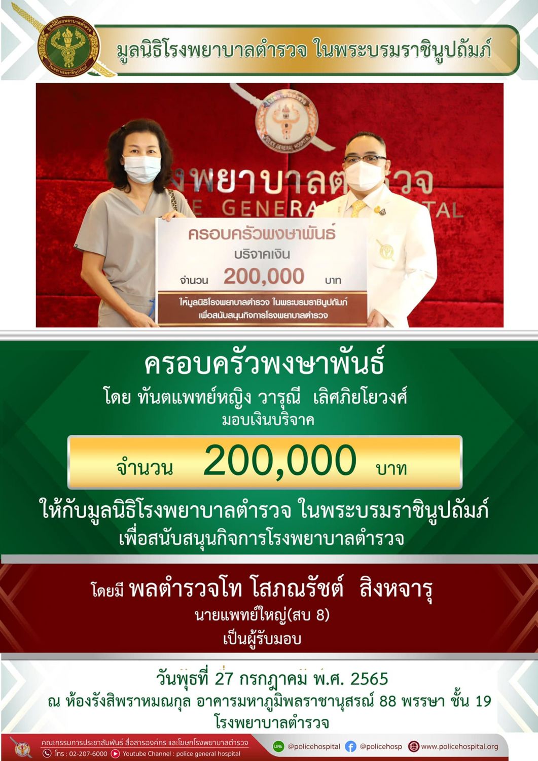 ครอบครัวพงษาพันธ์ โดยทันตแพทย์หญิง วารุณี เลิศภิยโยวงศ์ บริจาคเงิน ให้มูลนิธิโรงพยาบาลตำรวจในพระบรมราชินูปถัมภ์