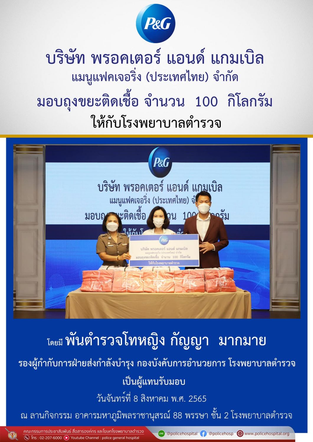 เมื่อวันจันทร์ที่ 8 สิงหาคม พ.ศ. 2565 บริษัท พรอคเตอร์ แอนด์ แกมเบิล แมนูแฟคเจอริ่ง (ประเทศไทย) จำกัด มอบถุงขยะติดเชื้อจำนวน 100 กิโลกรัม ให้โรงพยาบาลตำรวจ โดยมี พันตำรวจโทหญิง กัญญา มากมาย รองผู้กำกับการฝ่ายส่งกำลังบำรุง กองบังคับการอำนวยการ โรงพยาบาลตำรวจ เป็นผู้แทนรับมอบ ณ ลานกิจกรรม อาคารมหาภูมิพลราชานุสรณ์ 88 พรรษา ชั้น 2 โรงพยาบาลตำรวจ
