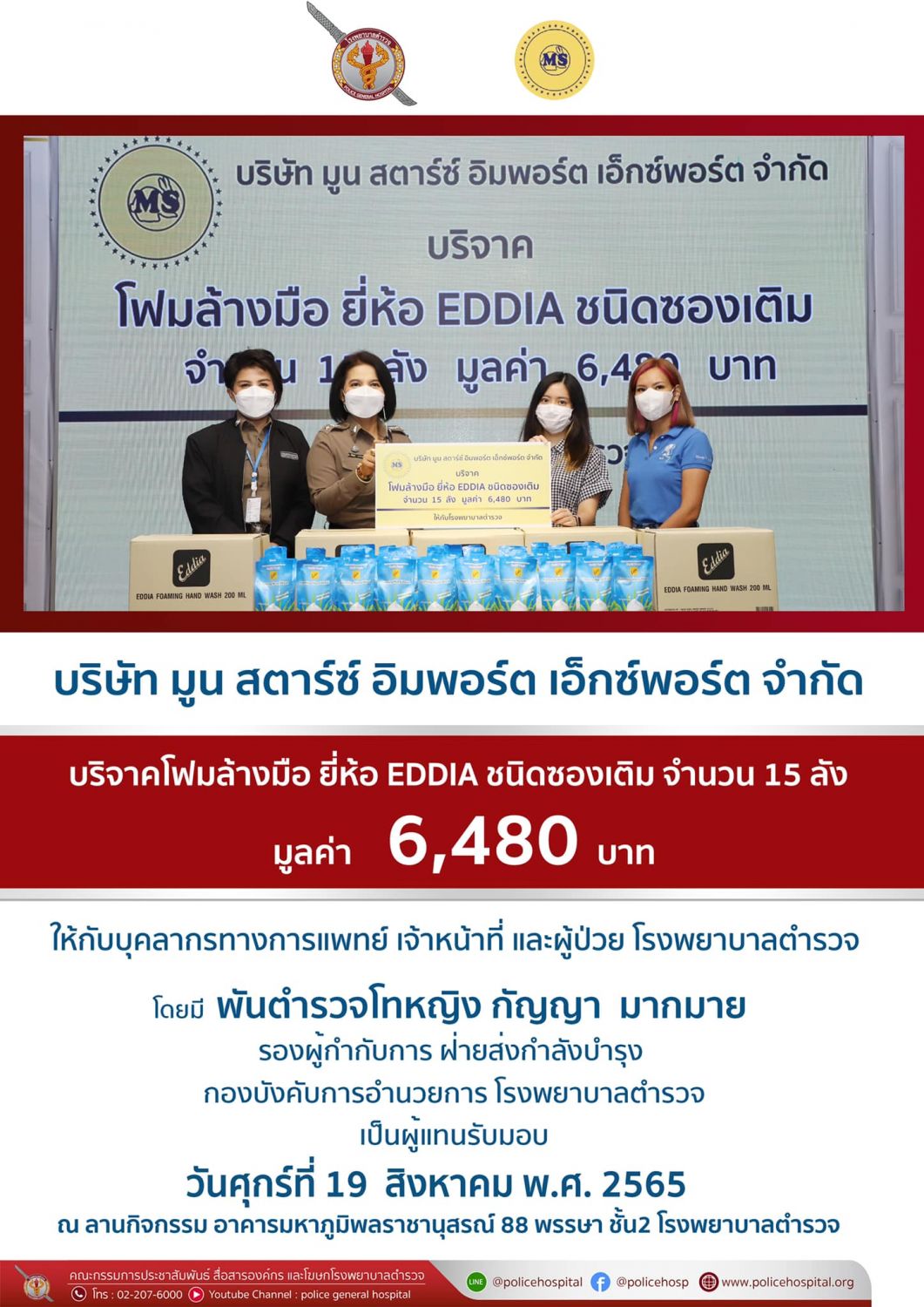 บริษัท มูน สตาร์ซ์ อิมพอร์ต เอ็กซ์พอร์ต จำกัด บริจาคโฟมล้างมือ ยี่ห้อ EDDIA ชนิดซองเติม ให้บุคลากรทางการแพทย์ เจ้าหน้าที่ และผู้ป่วย โรงพยาบาลตำรวจ
