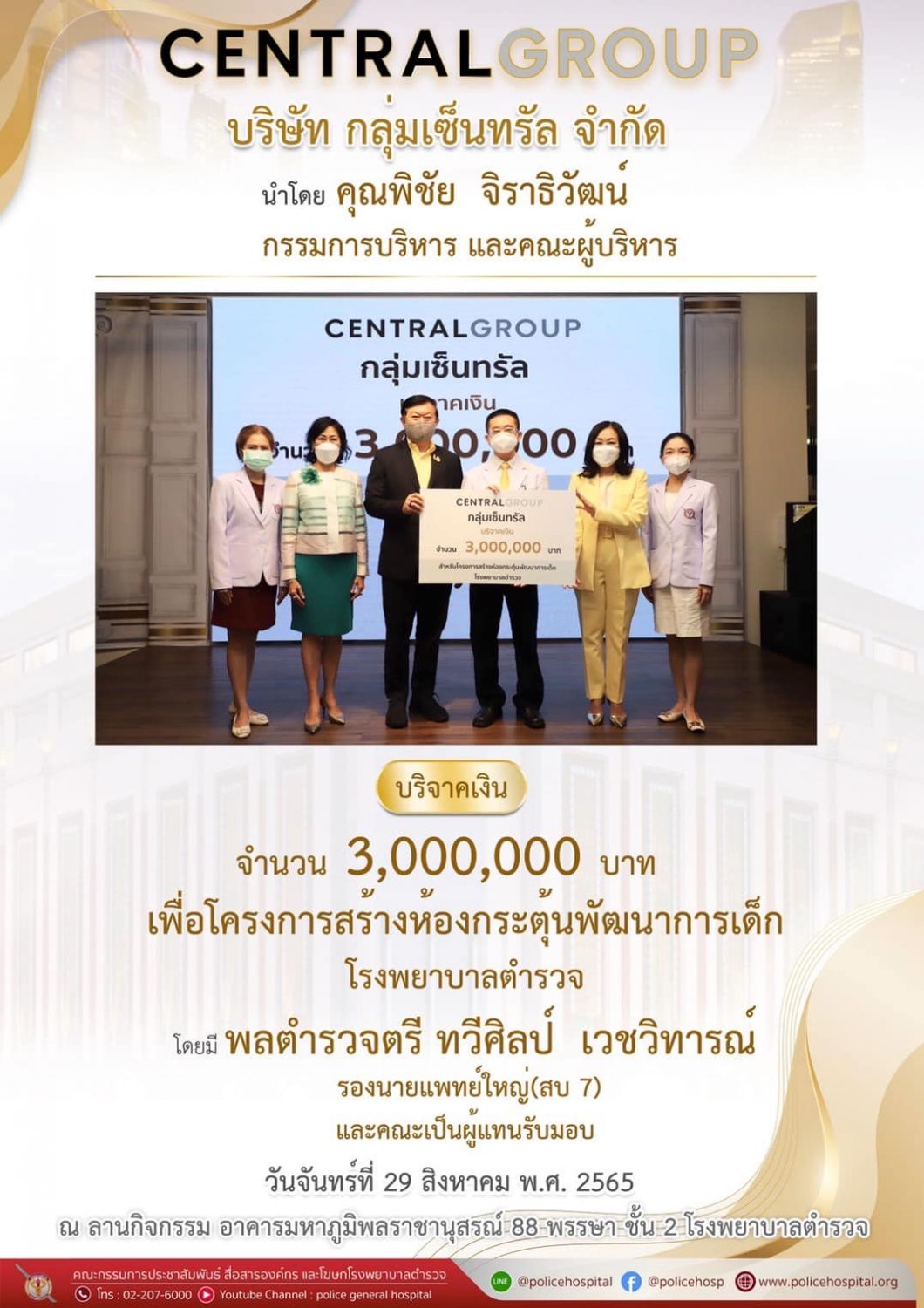 เมื่อวันจันทร์ที่ 29 สิงหาคม พ.ศ. 2565 บริษัท กลุ่มเซ็นทรัล จำกัด โดย คุณพิชัย จิราธิวัฒน์ กรรมการบริหาร บริษัท กลุ่มเซ็นทรัล จำกัด และคณะผู้บริหาร บริจาคเงิน 3,000,000 บาท ให้มูลนิธิโรงพยาบาลตำรวจ ในพระบรมราชินูปถัมภ์ เพื่อโครงการสร้างห้องกระตุ้นพัฒนาการเด็ก กลุ่มงานกุมารเวชกรรม โรงพยาบาลตำรวจ โดยมี พลตำรวจตรี ทวีศิลป์ เวชวิทารณ์ รองนายแพทย์ใหญ่(สบ 7) และคณะเป็นผู้แทนรับมอบ ณ ลานกิจกรรม อาคารมหาภูมิพลราชานุสรณ์ 88 พรรษา ชั้น 2 โรงพยาบาลตำรวจ