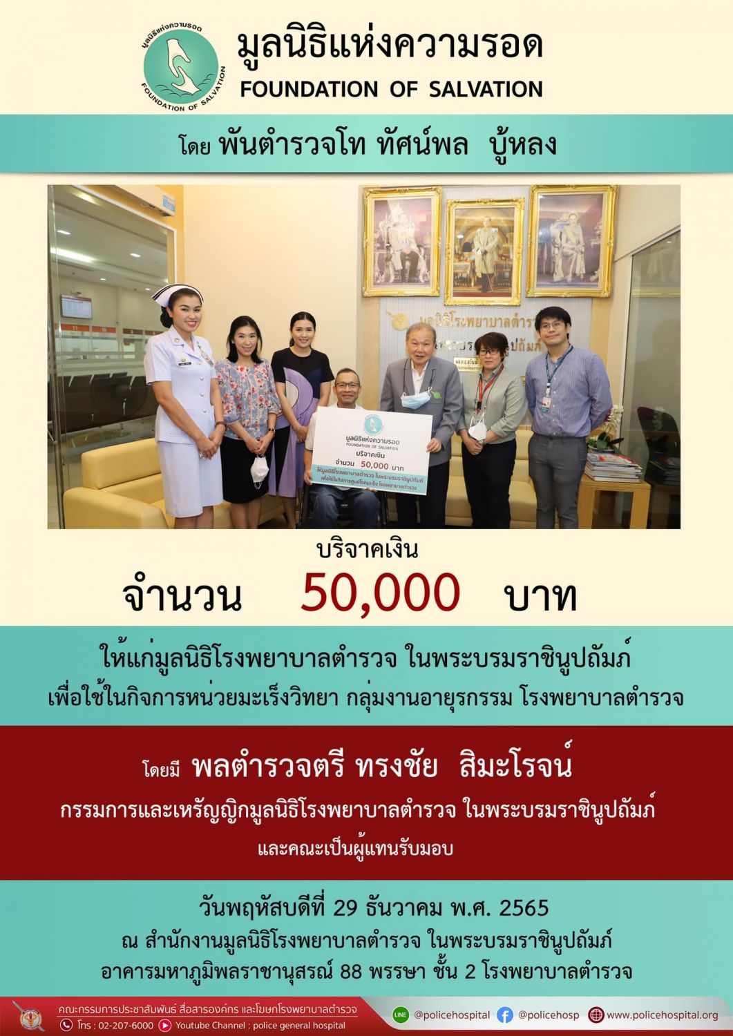 เมื่อวันพฤหัสบดีที่ 29 ธันวาคม พ.ศ. 2565 มูลนิธิแห่งความรอด (Foundation of Salvation) โดย พันตำรวจโท ทัศน์พล บู้หลง และคณะ บริจาคเงิน 50,000 บาท ให้มูลนิธิโรงพยาบาลตำรวจในพระบรมราชินูปถัมภ์ เพื่อใช้ในกิจการหน่วยมะเร็งวิทยา กลุ่มงานอายุรกรรม โรงพยาบาลตำรวจ โดยมี พลตำรวจตรี ทรงชัย สิมะโรจน์ กรรมการและเหรัญญิก มูลนิธิโรงพยาบาลตำรวจ ในพระบรมราชินูปถัมภ์ และคณะเป็นผู้แทนรับมอบ ณ สำนักงานมูลนิธิโรงพยาบาลตำรวจ ในพระบรมราชินูปถัมภ์ อาคารมหาภูมิพลราชานุสรณ์ 88 พรรษา ชั้น 2 โรงพยาบาลตำรวจ