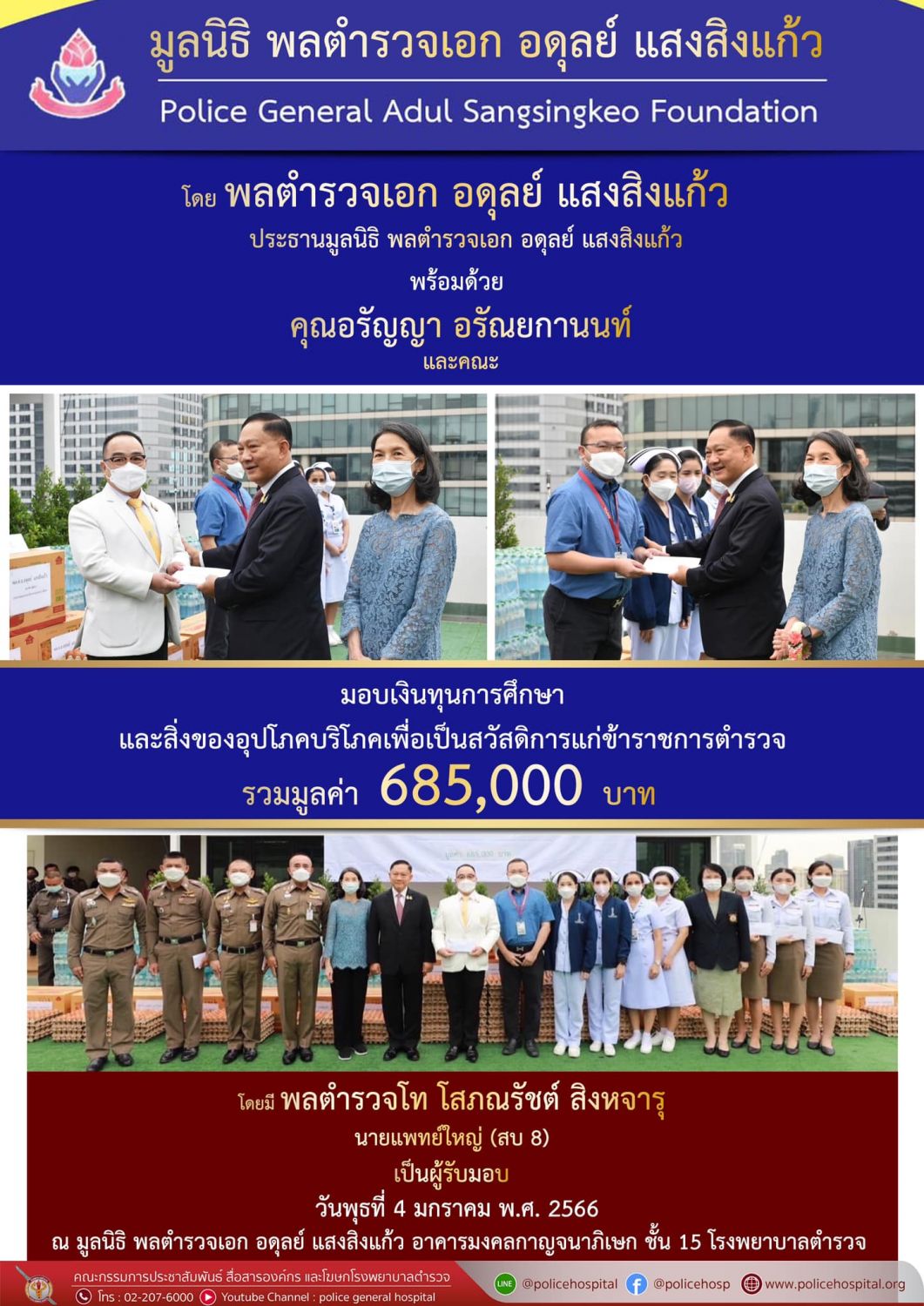 เมื่อวันพุธที่ 4 มกราคม พ.ศ. 2566 มูลนิธิพลตำรวจเอก อดุลย์ แสงสิงแก้ว โดย พลตำรวจเอก อดุลย์ แสงสิงแก้ว ประธานมูลนิธิพลตำรวจเอก อดุลย์ แสงสิงแก้ว คุณอรัญญา อรัณยกานนท์ และคณะ มอบเงิน ทุนการศึกษา และสิ่งของอุปโภคบริโภค เพื่อเป็นสวัสดิการแก่ข้าราชการตำรวจ รวมมูลค่า 685,000 บาท โดยมี พลตำรวจโท โสภณรัชต์ สิงหจารุ นายแพทย์ใหญ่(สบ8) และคณะเป็นผู้รับมอบ ณ มูลนิธิพลตำรวจเอก อดุลย์ แสงสิงแก้ว อาคารมงคลกาญจนาภิเษก ชั้น 15 โรงพยาบาลตำรวจ