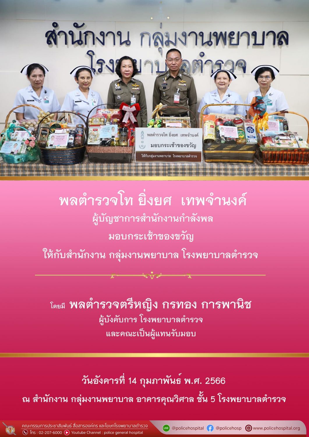 เมื่อวันอังคารที่ 14 กุมภาพันธ์ พ.ศ.2566 พลตำรวจโท ยิ่งยศ เทพจำนงค์ ผู้บัญชาการสำนักงานกำลังพล มอบกระเช้าของขวัญ ให้กับสำนักงานกลุ่มงานพยาบาล โรงพยาบาลตำรวจ โดยมี พลตำรวจตรีหญิง กรทอง การพานิช ผู้บังคับการ โรงพยาบาลตำรวจ เป็นผู้แทนรับมอบ ณ สำนักงานกลุ่มงานพยาบาล อาคารคุณวิศาล ชั้น 5 โรงพยาบาลตำรวจ