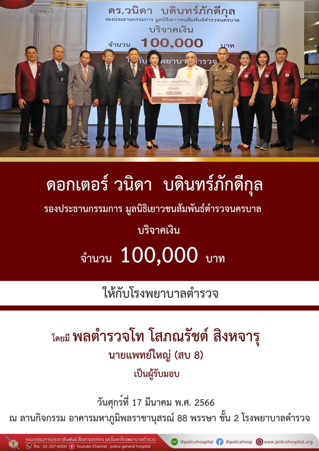 ดอกเตอร์วนิดา บดินทร์ภักดีกุล รองประธานกรรมการ มูลนิธิเยาวชนสัมพันธ์ตำรวจนครบาล บริจาคเงิน ให้โรงพยาบาลตำรวจ