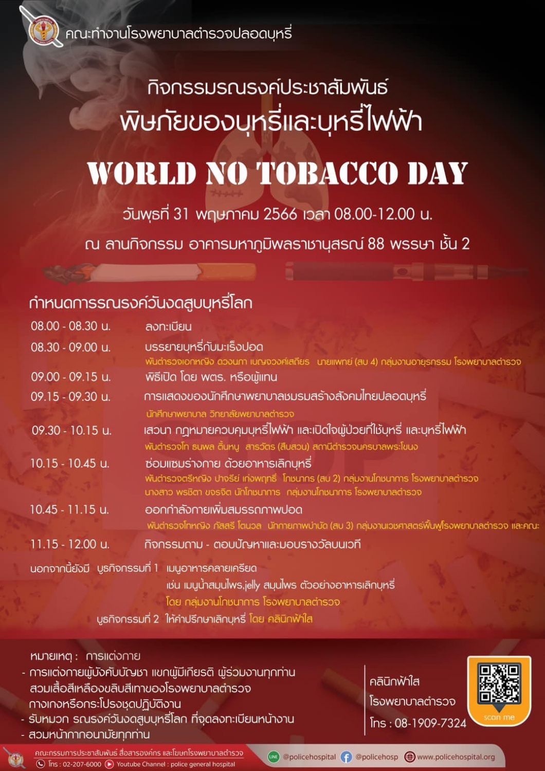 ขอเรียนเชิญข้าราชการตำรวจ บุคลากรโรงพยาบาลตำรวจ และประชาชน ร่วมกิจกรรมรณรงค์เนื่องในวันงดสูบบุหรี่โลก เรื่อง “พิษภัยของบุหรี่และบุหรี่ไฟฟ้า World No Tobacco Day”