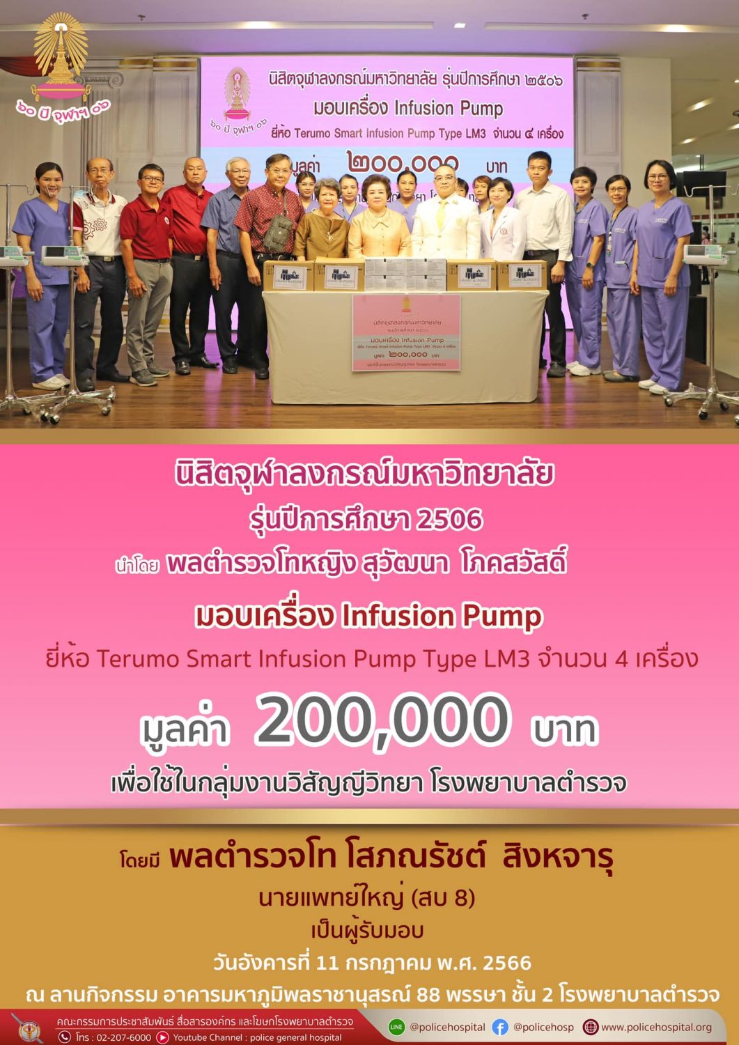 เมื่อวันอังคารที่ 11 กรกฎาคม พ.ศ.2566 นิสิตจุฬาลงกรณ์มหาวิทยาลัย รุ่นปีการศึกษา 2506 โดย พลตำรวจโทหญิง สุวัฒนา โภคสวัสดิ์ และคณะ มอบเครื่อง Infusion Pump ยี่ห้อ Terumo Smart Infusion Pump Type LM3 จำนวน 3 เครื่อง รวมมูลค่า 200,000 บาท ให้โรงพยาบาลตำรวจ เพื่อใช้ในกลุ่มงานวิสัญญีวิทยา โรงพยาบาลตำรวจ โดยมี พลตำรวจโท โสภณรัชต์ สิงหจารุ นายแพทย์ใหญ่(สบ8) เป็นผู้รับมอบ ณ ลานเอนกประสงค์ อาคารมหาภูมิพลราชานุสรณ์ 88 พรรษา ชั้น 2 โรงพยาบาลตำรวจ