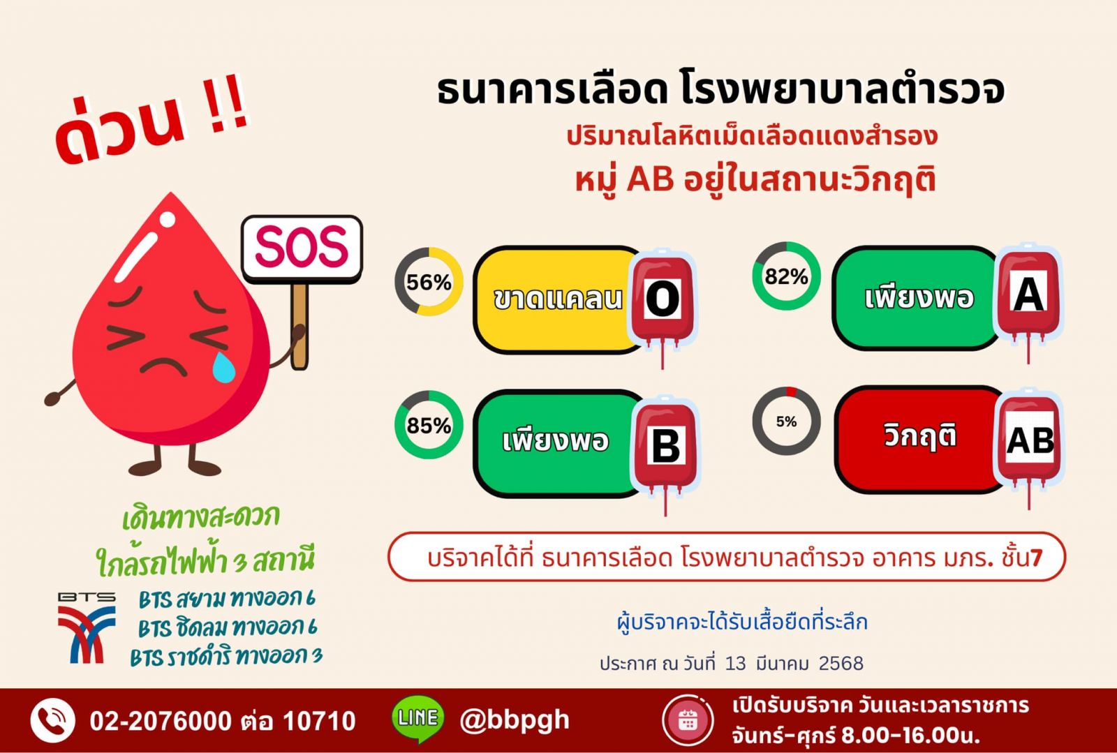 ปริมาณโลหิตเม็ดเลือดแดงสำรองในคลังของธนาคารเลือด โรงพยาบาลตำรวจ หมู่ AB อยู่ในสถานะวิกฤติ