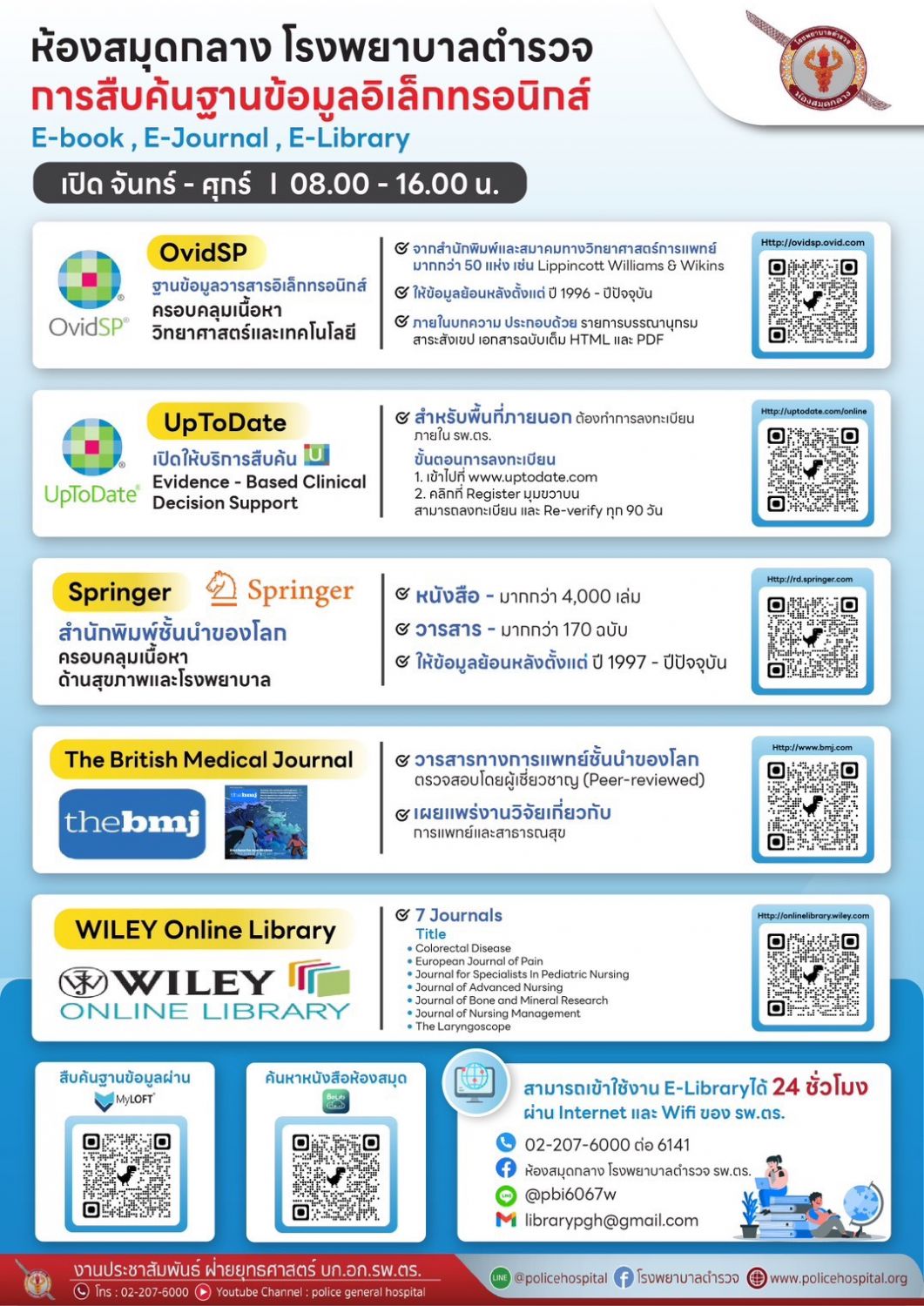 ห้องสมุดกลาง รพ.ตร. เปิดให้บริการฐานข้อมูลอิเล็กทรอนิกส์ เพื่อให้แพทย์, นักศึกษาแพทย์, แพทย์ประจำบ้าน, พยาบาล, นักศึกษาพยาบาล และบุคลากรของ รพ.ตร. เข้าใช้งานฐานข้อมูลอิเล็กทรอนิกส์