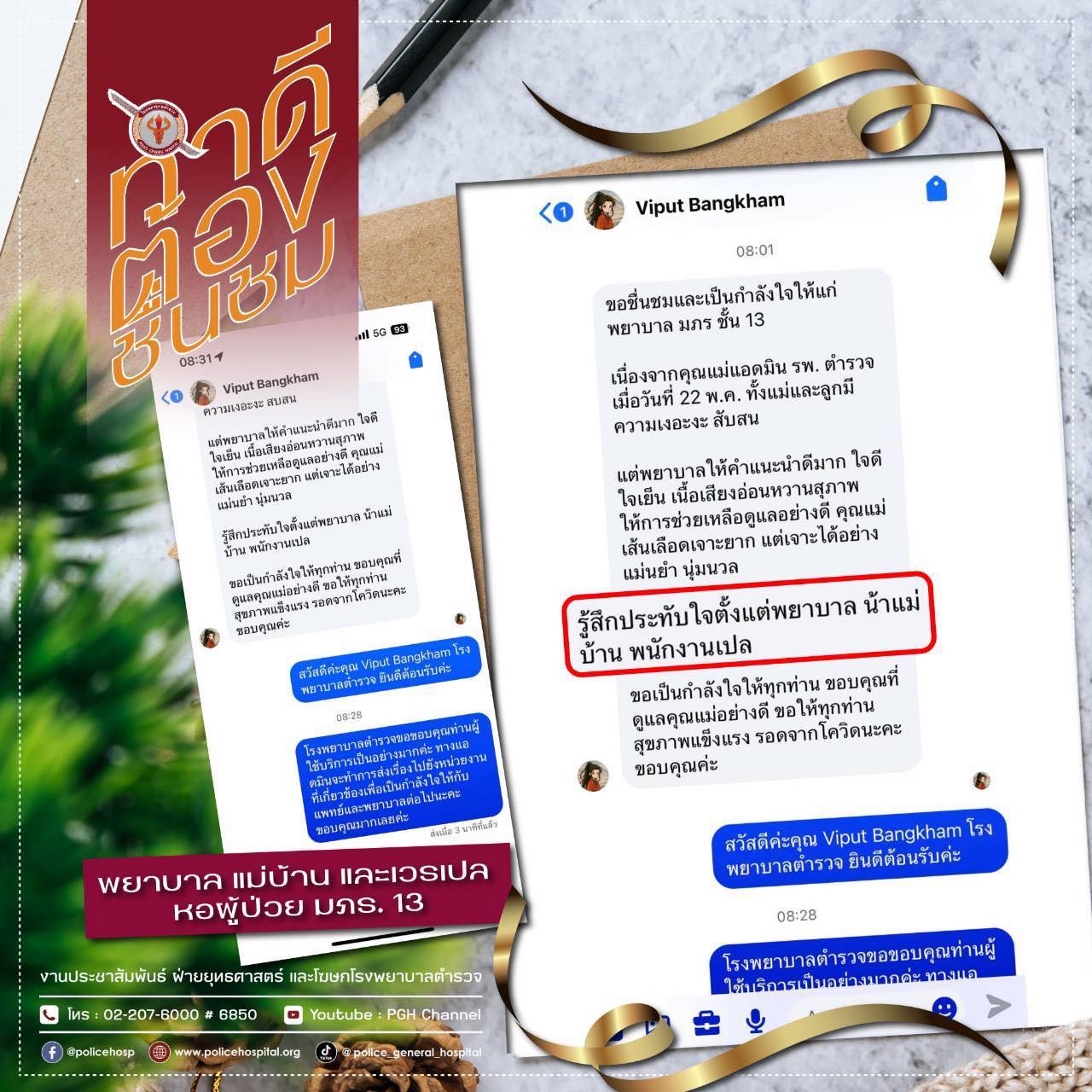 ผู้ป่วยยังขอเป็นกำลังใจให้บุคลากรที่ปฏิบัติหน้าที่ หอผู้ป่วย มภร. 13 ทุกคนสุขภาพร่างกายแข็งแรง