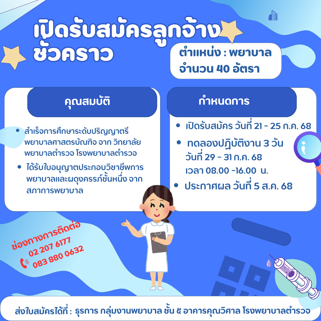 ส่งใบสมัครได้ที่ ธุรการ กลุ่มงานพยาบาล ชั้น 5 อาคารคุณวิศาล โรงพยาบาลตำรวจ โทร 02-207-6177 หรือ 083-880-0632