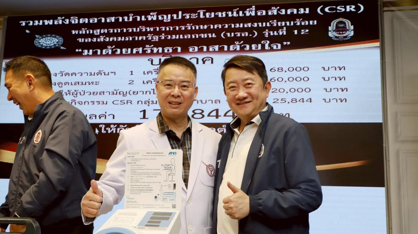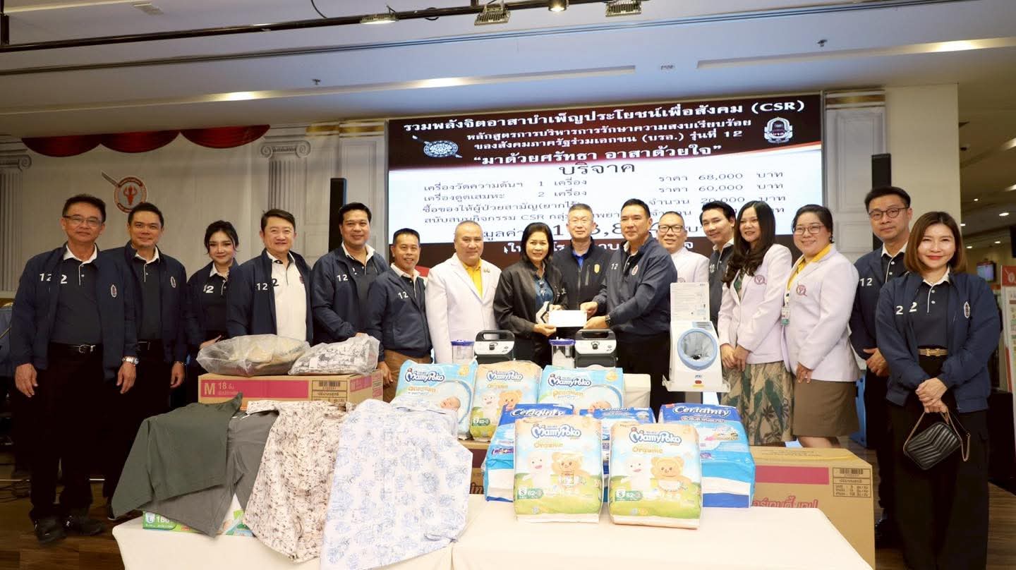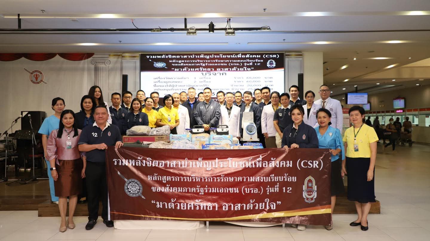 วันศุกร์ที่ 25 กรกฎาคม 2568 ณ ลานกิจกรรม ชั้น2 อาคารมหาภูมิพลราชานุสรณ์ 88 พรรษา โรงพยาบาลตำรวจ คณะรวมพลังจิตอาสาบำเพ็ญประโยชน์เพื่อสังคม (CSR) หลักสูตรการบริหารการรักษาความสงบเรียบร้อยของสังคมภาครัฐร่วมเอกชน (บรอ.) รุ่นที่ 12 "มาด้วยศรัทธา อาสาด้วยใจ" บริจาคเครื่องวัดความดันฯ 1 เครื่อง ราคา 68,000 บาท, เครื่องดูดเสมหะ 2 เครื่อง ราคา 60,000 บาท, ซื้อของให้ผู้ป่วยสามัญ(ยากไร้) จำนวน 20,000 บาท และสนับสนุนกิจกรรม CSR กลุ่มงานพยาบาล จำนวน 25,844 บาท รวมมูลค่า 173,844 บาท ให้กับโรงพยาบาลตำรวจ