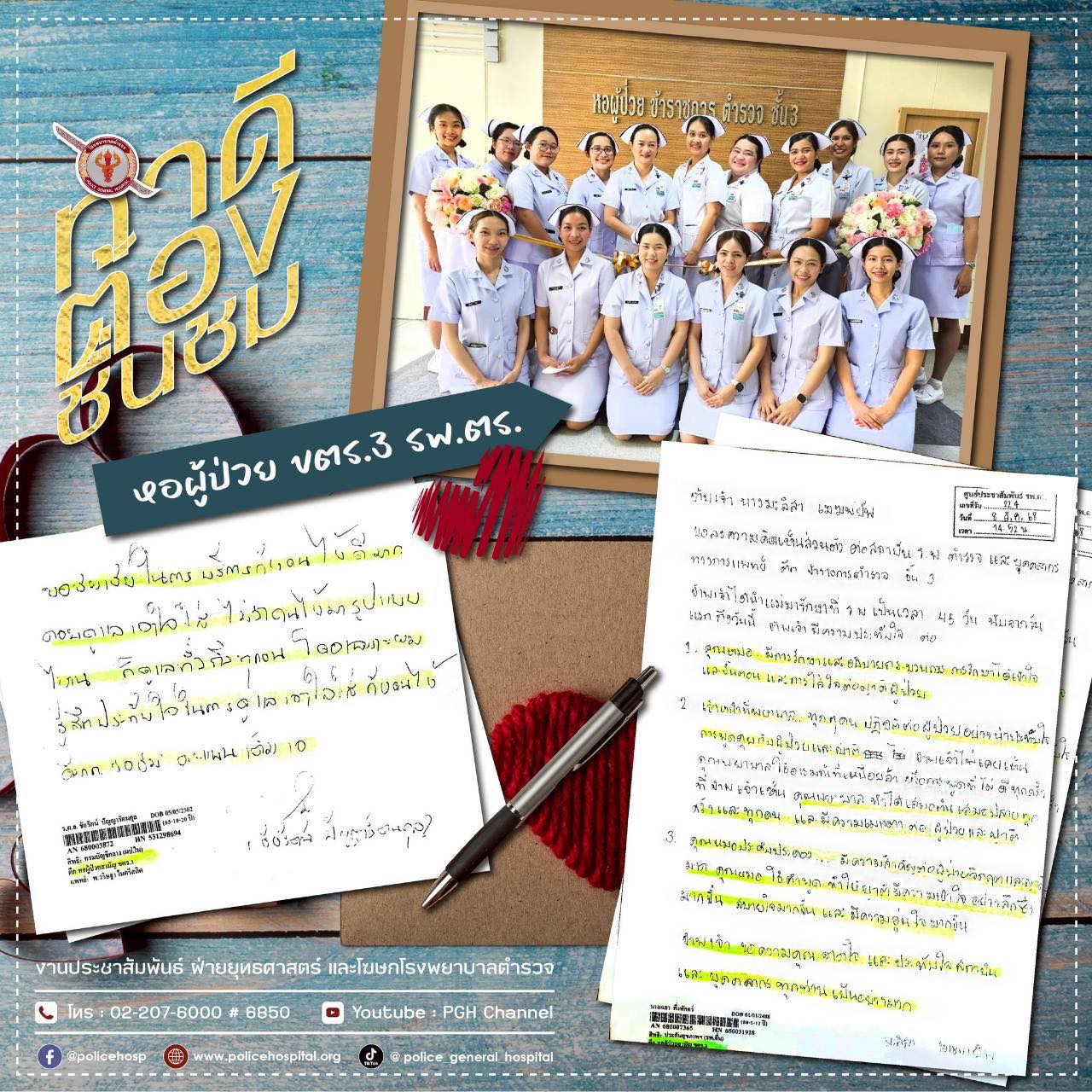 ผู้ป่วยที่ใช้บริการ หอผู้ป่วยข้าราชการตำรวจ 3 โรงพยาบาลตำรวจ ชื่นชม ทีมแพทย์ และพยาบาล ที่ดูแลเอาใจใส่ผู้ป่วยอย่างใกล้ชิด พูดจาไพเราะ ให้กำลังใจ ผู้ป่วยและญาติ และประทับใจทีมแพทย์ที่ให้คำแนะนำ อธิบาย ขั้นตอนการรักษาการปฏิบัติตัวอย่างละเอียด แบบเข้าใจง่าย ทุกท่านอัธยาศัยดี อารมณ์ดี ผู้ป่วยและญาติรู้สึกสบายใจขอขอบคุณทีมแพทย์ พยาบาลทุกคน
