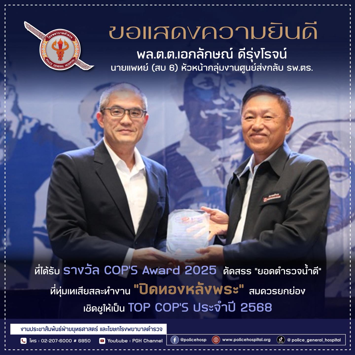 โดยบันทึกเป็นรางวัล COP’S Award 2025 คัดสรร “ยอดตำรวจน้ำดี”ที่ทุ่มเทเสียสละ ทำงาน “ปิดทองหลังพระ” สมควรยกย่องเชิดชูให้เป็น TOP COP’S ประจำปี 2568