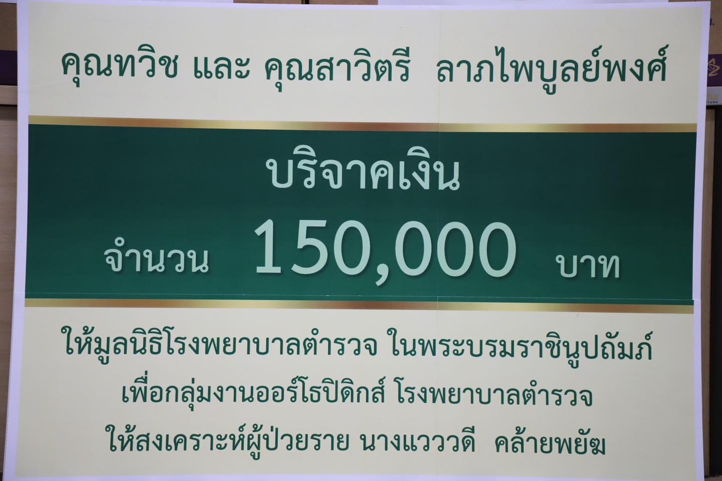 โดย พล.ต.ต.ทรงชัย สิมะโรจน์ เหรัญญิกมูลนิธิโรงพยาบาลตำรวจ ในพระบรมราชินูปถัมภ์ รับมอบพร้อมกล่าวขอบคุณ คุณทวิช และ คุณสาวิตรี ลาภไพบูลย์พงศ์ ที่บริจาคเงิน จำนวน 150,000 บาทให้ในครั้งนี้ ทางมูลนิธิโรงพยาบาลตำรวจ ในพระบรมราชินูปถัมภ์ จะนำเงินไปใช้ตามวัตถุประสงค์ของผู้บริจาค เพื่อประโยชน์สูงสุดของผู้ป่วย