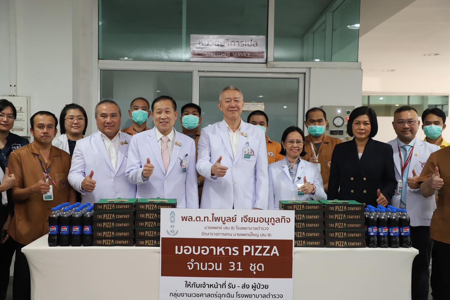 นอกจากนี้ พล.ต.ท.ไพบูลย์ เจียมอนุกูลกิจ นายแพทย์ (สบ 8)โรงพยาบาลตำรวจ รักษาราชการแทนนายแพทย์ใหญ่ (สบ 8)พร้อมคณะผู้บริหารมอบพิซซ่า เพื่อแสดงความขอบคุณ และเป็นขวัญและกำลังใจแก่เจ้าหน้าที่เวรเปลของโรงพยาบาลตำรวจ ณ อาคาร มภร. ชั้น 2 โรงพยาบาลตำรวจ