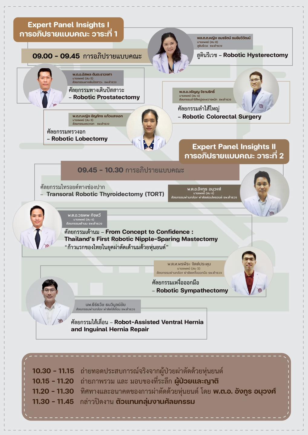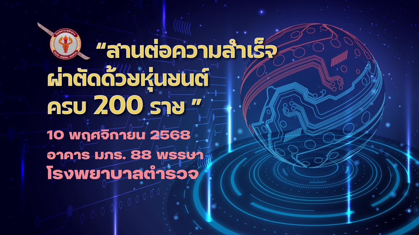โรงพยาบาลตำรวจขอเชิญบุคลากรของโรงพยาบาลตำรวจ และประชาชนทั่วไปร่วมกิจกรรมงาน “สานต่อความสำเร็จ” นำเอาเทคโนโลยีทันสมัยหุ่นยนต์ผ่าตัด โรงพยาบาลตำรวจ ยกระดับการรักษาพยาบาล สืบสานปณิธานและเพื่อน้อมถวายความอาลัยสมเด็จพระบรมราชชนนีพันปีหลวง และร่วมฟังการอภิปรายแบบคณะ การถ่ายทอดประสบการณ์จริงจากผู้ป่วยและคณะแพทย์ผู้เชี่ยวชาญ รวมถึงการอภิปรายในหัวข้อ “ทิศทางและอนาคตของการผ่าตัดด้วยหุ่นยนต์”