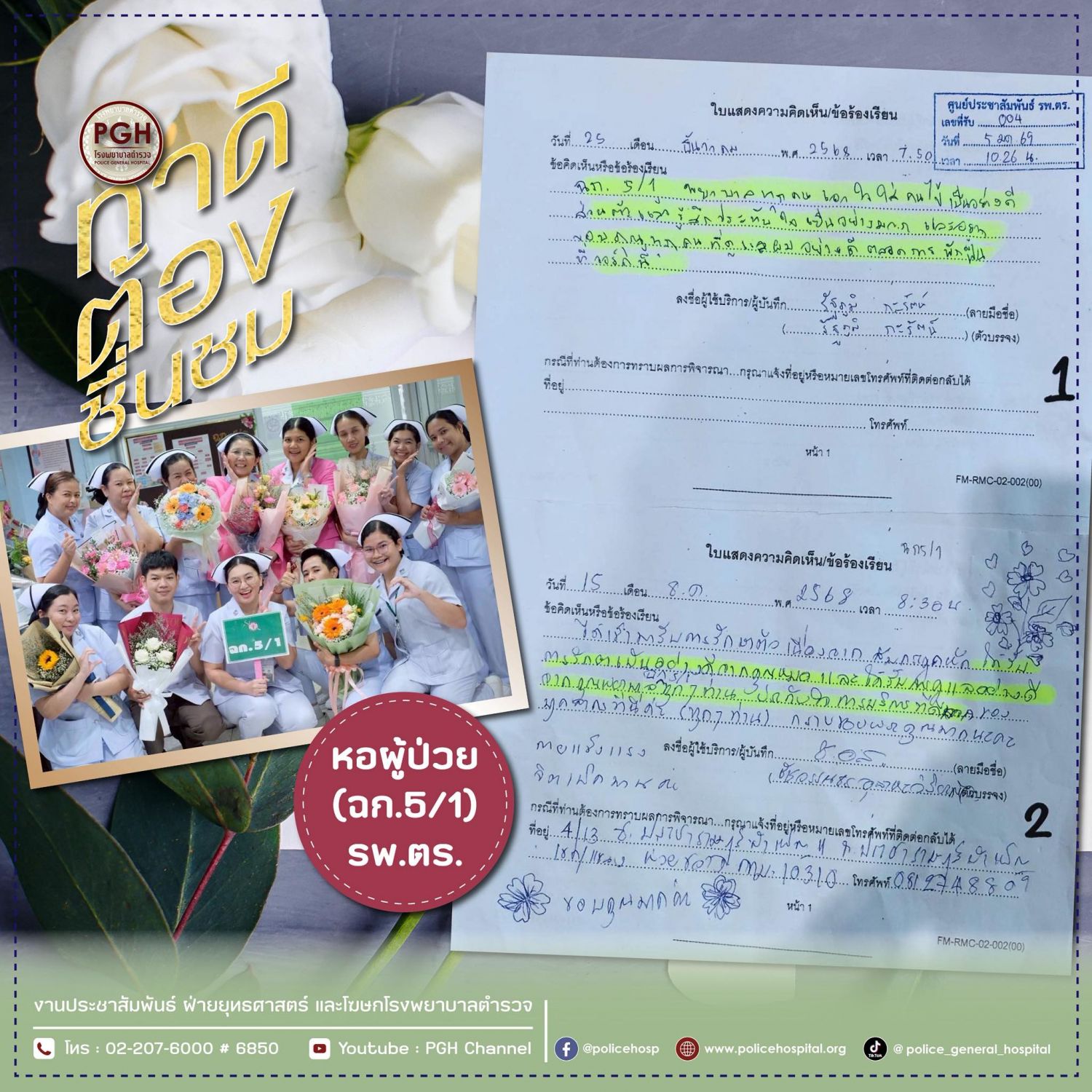 ผู้มาใช้บริการหอผู้ป่วย (ฉก.5/1) โรงพยาบาลตำรวจ ชื่นชม ทีมแพทย์ พยาบาลและเจ้าหน้าที่ทุกคน ที่ดูแลเอาใจใส่ผู้ป่วยเป็นอย่างดีตลอดเวลาที่พักฟื้น และประทับใจการให้บริการของเจ้าหน้าที่ทุกคน