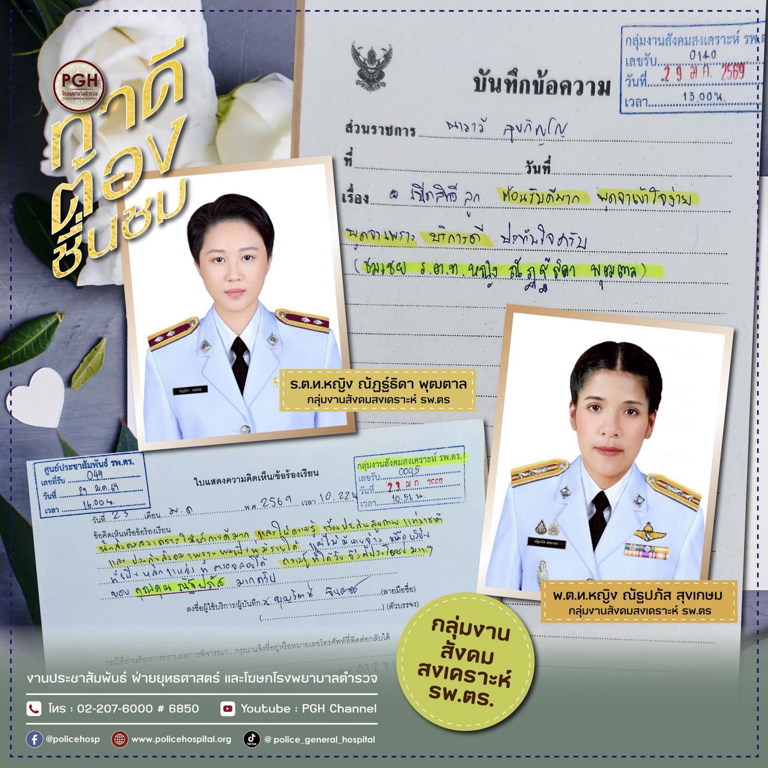 ผู้มาใช้บริการกลุ่มงานสังคมสงเคราะห์ โรงพยาบาลตำรวจ แสดงความชื่นชม พ.ต.ท.หญิง ณัฐปภัส สุขเกษม และ ร.ต.ท.หญิง ณัฏฐ์ธิดา พุฒตาล กลุ่มงานสังคมสงเคราะห์ โรงพยาบาลตำรวจ ที่ดูแล ผู้ป่วยอย่างดี พูดจาไพเราะ แนะนำทั้งเรื่องดูแลสุขภาพ เรื่องประกันสุขภาพ และเรื่องอื่นๆดีมาก รู้สึกประทับใจ และขอบคุณบุคลากรทุกคน