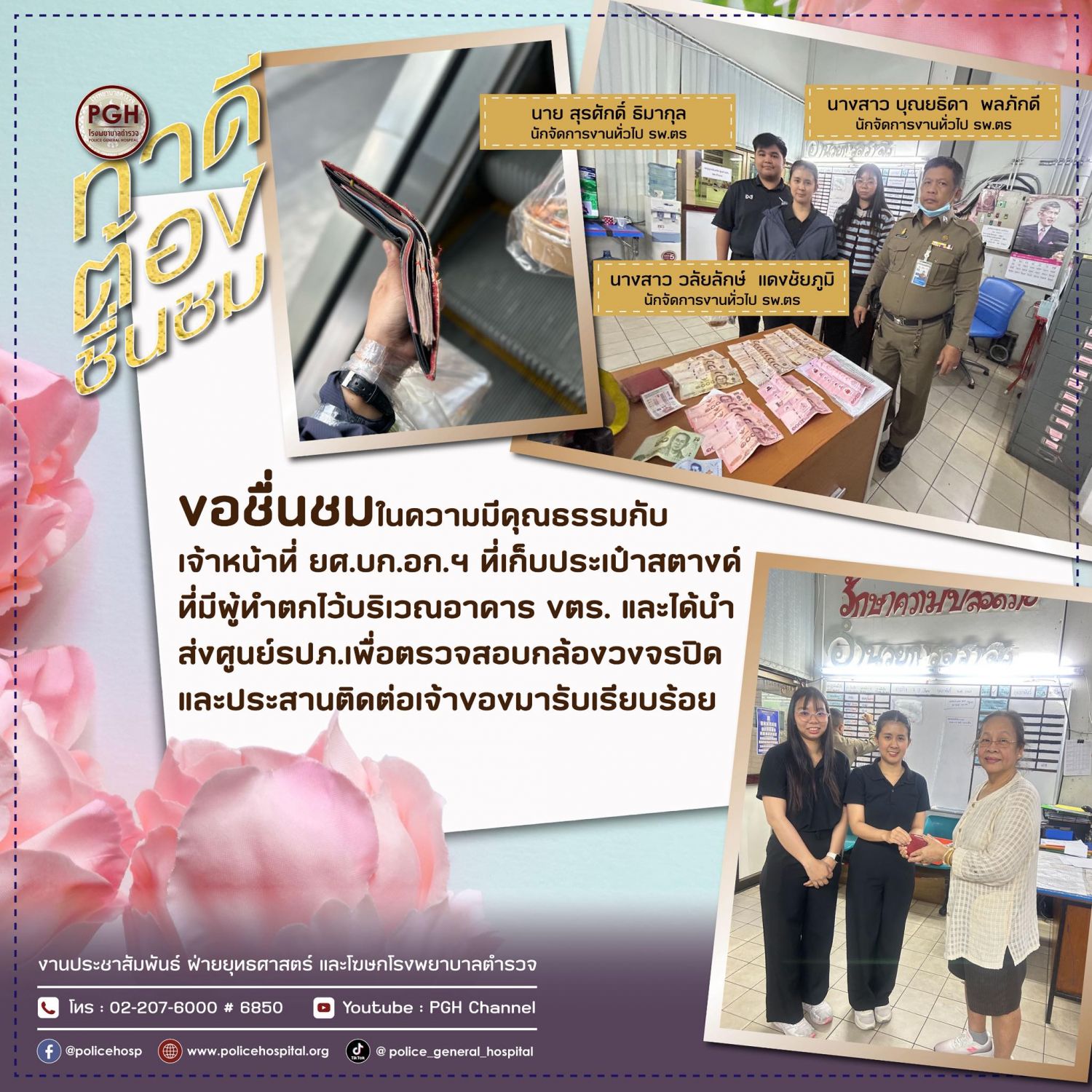 โรงพยาบาลตำรวจ ขอชื่นชม นาย สุรศักดิ์ ธิมากุล, น.ส.บุณยธิดา พลภักดี และ นางสาว วลัยลักษ์ แดงชัยภูมิ นักจัดการงานทั่วไป กลุ่มงานยุทธศาสตร์กองบังคับการอำนวยการ โรงพยาบาลตำรวจ ที่เก็บกระเป๋าสตางค์ที่มีผู้ทำตกไว้บริเวณอาคารข้าราชการตำรวจ และนำส่งศูนย์รปภ. เพื่อตรวจสอบกล้องวงจรปิด ประสานติดต่อเจ้าของมารับ