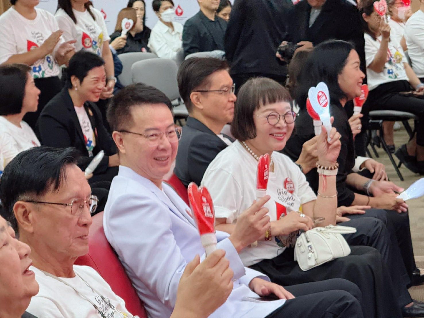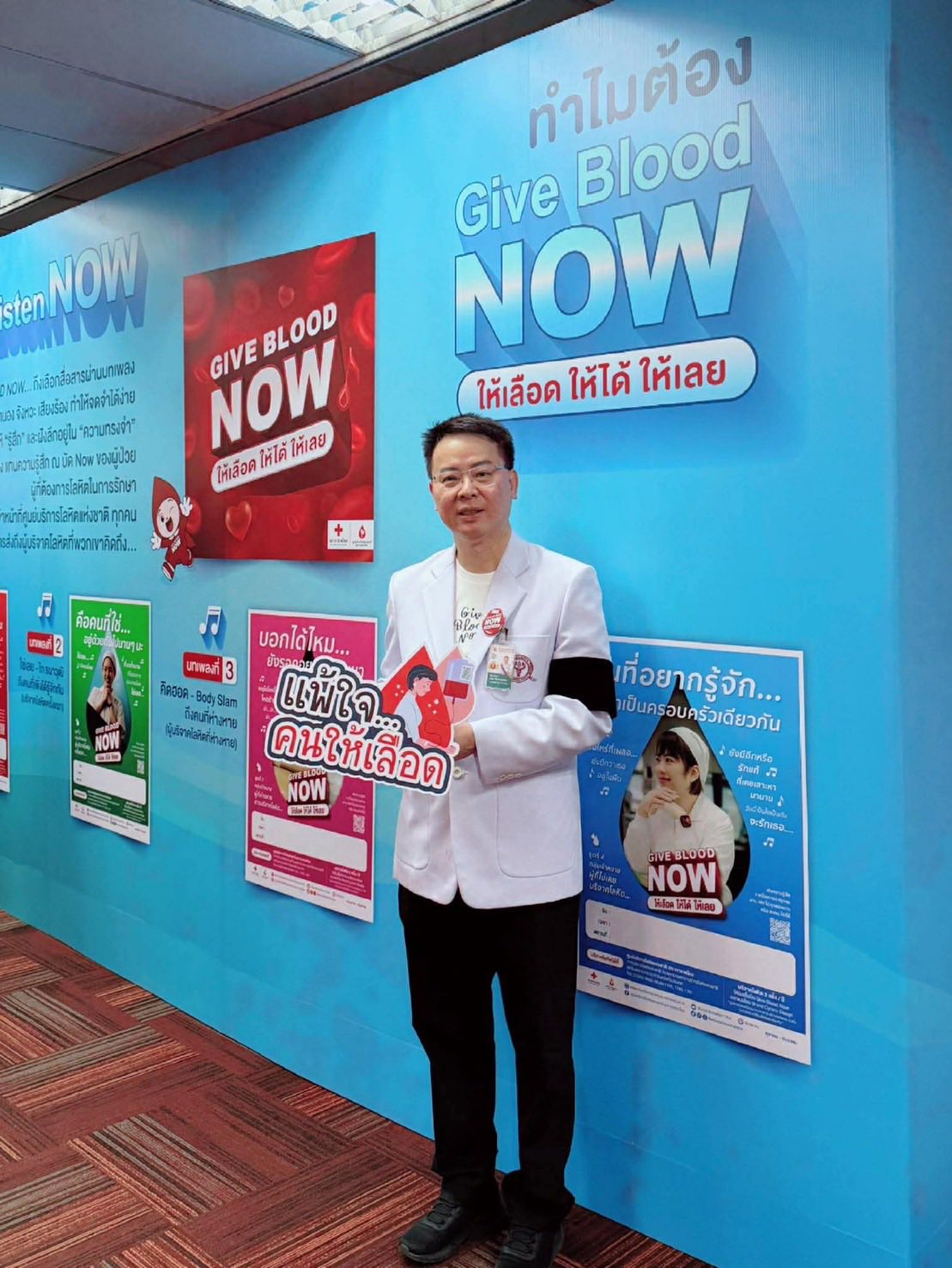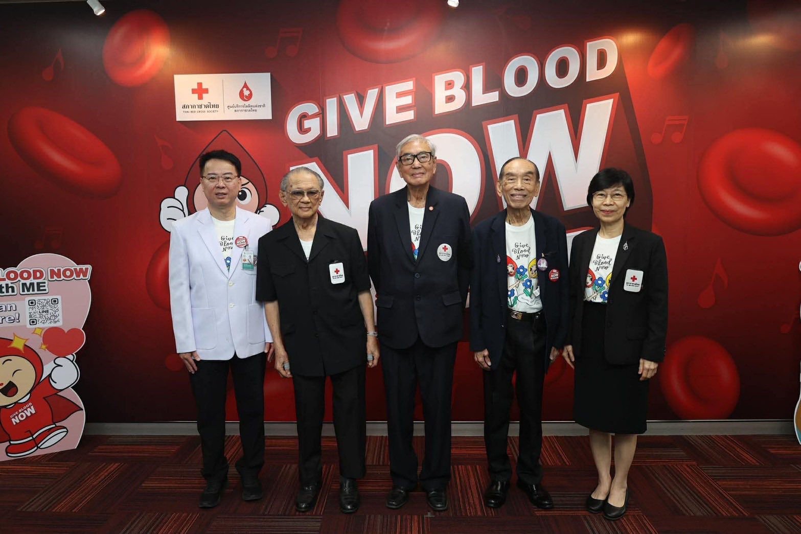 มีผู้บริหารสภากาชาดไทย ที่ปรึกษา และคณะกรรมการจัดหาและส่งเสริมผู้ให้โลหิตแห่งสภากาชาดไทย, ผู้บริหารหน่วยงานพันธมิตร ที่ให้การสนับสนุนจัดทำเสื้อยืดที่ระลึก "Give Blood Now" อาทิ บริษัท กลุ่มเซ็นทรัล จำกัด, บริษัท เดอะมอลล์ กรุ๊ป จำกัด, บริษัท กรุงเทพประกันภัย จำกัด (มหาชน), บริษัท ไทยเบฟเวอเรจ จำกัด (มหาชน), บริษัท ไทยประกันชีวิต จำกัด (มหาชน), บริษัท ไทยฮอนด้า แมนูแฟคเจอริ่ง จำกัด, ธนาคารกรุงไทย จำกัด (มหาชน), ธนาคารไทยพาณิชย์ จำกัด (มหาชน), ธนาคารอาคารสงเคราะห์ และธนาคารออมสิน