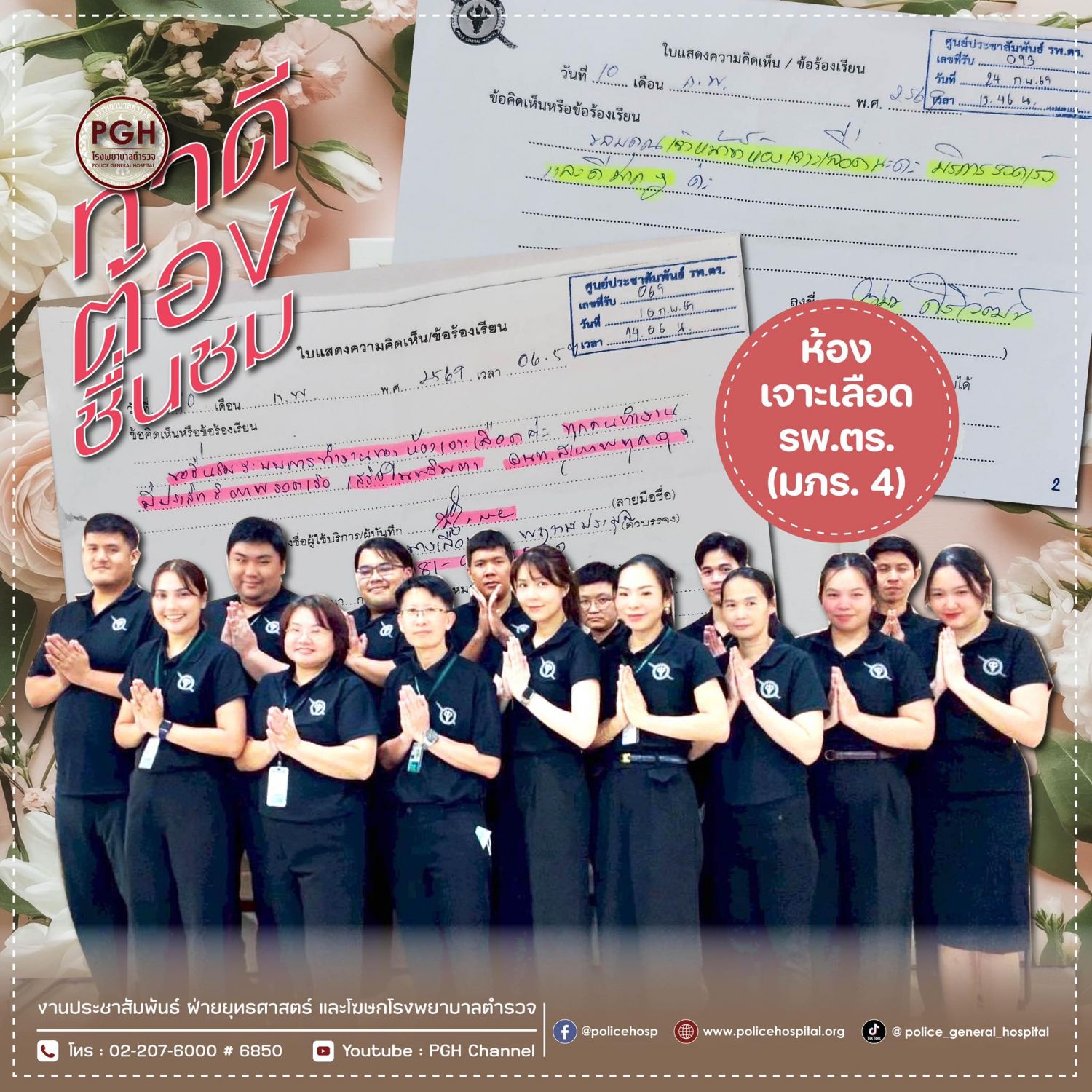 ผู้มาใช้บริการ ห้องเจาะเลือด (มภร.4) โรงพยาบาลตำรวจ ชื่นชมเจ้าหน้าที่ที่ให้บริการห้องเจาะเลือด ซึ่งทำงานอย่างรวดเร็ว มีประสิทธิภาพ และประทับใจระบบการทำงานที่ให้บริการสะดวกรวดเร็ว