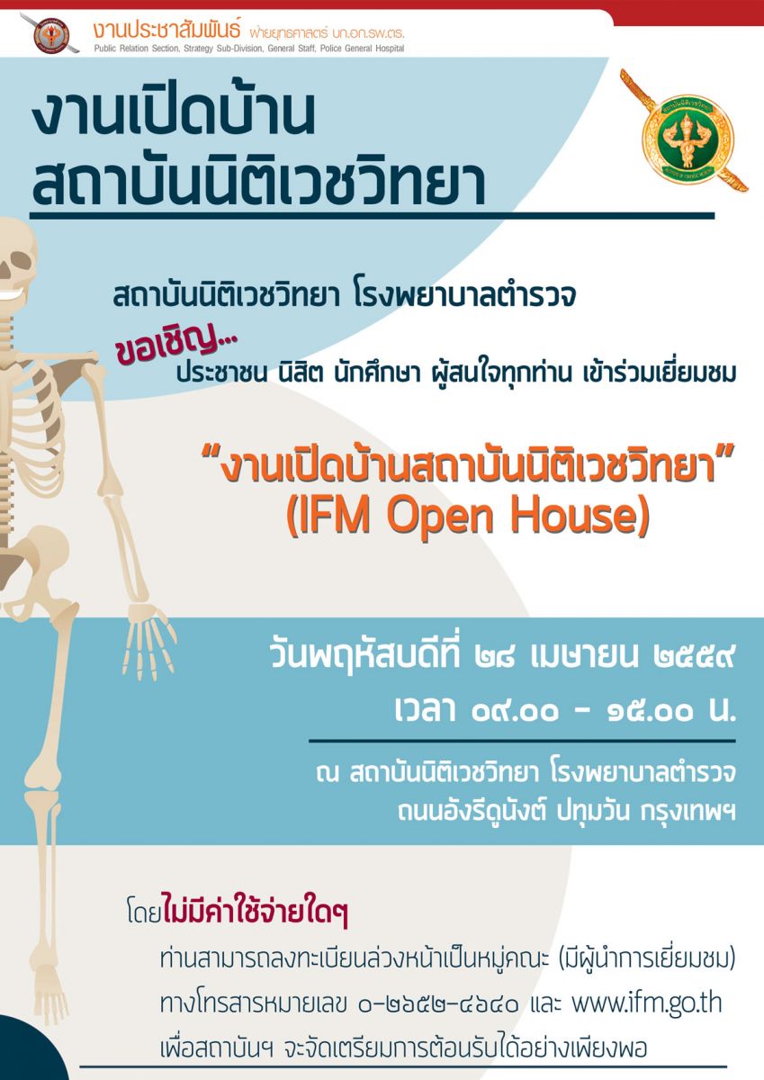 งานเปิดบ้าน สถาบันนิติเวชวิทยา โรงพยาบาลตำรวจ ขอเชิญ ประชาชน นิสิต นักศึกษา ผู้สนใจทุกท่าน เข้าร่วมเยี่ยม "งานเปิดบ้านสถาบันนิติเวชวิทยา" (IFM Open House)