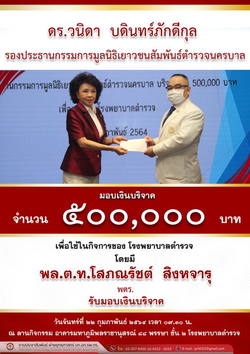 ดร.วนิดา บดินทร์ภักดีกุล รองประธานกรรมการมูลนิธิเยาวชนสัมพันธ์ตำรวจนครบาล บริจาคเงิน 500,000 บาท