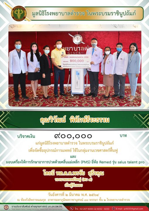 คุณวิวัฒน์ พิทักษ์ธีระธรรม ผู้แทนบริษัท วงษ์สยามก่อสร้าง จำกัด บริจาคเงิน 900,000 บาท เพื่อจัดซื้อเครื่องรักษาอาการปวดด้วยคลื่นแม่เหล็ก (PMS)
