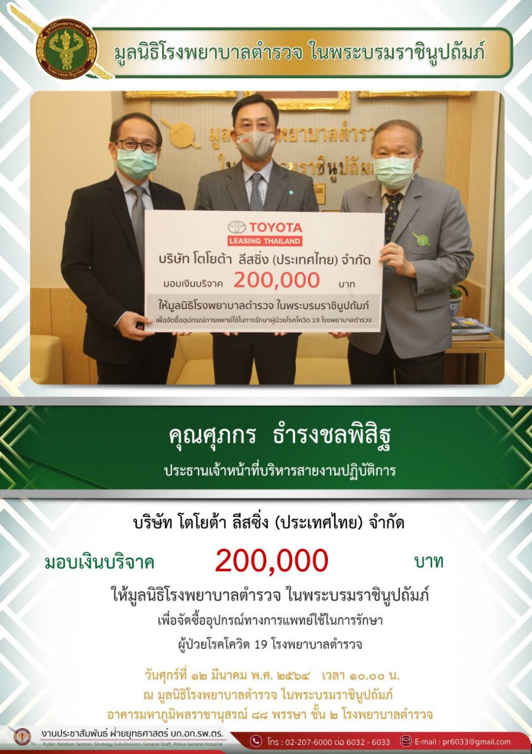 คุณศุภกร ธำรงชลพิสิฐ ประธานเจ้าหน้าที่บริหารสายงานปฏิบัติการ บริษัท โตโยต้า ลิสซิ่ง (ประเทศไทย) จำกัด บริจาคเงิน