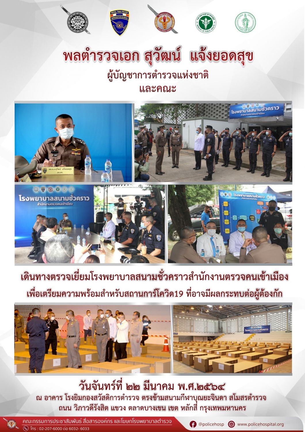 เมื่อวันที่ 22 มีนาคม 2564 เวลา 14.00 น. พลตำรวจเอก สุวัฒน์ แจ้งยอดสุข ผู้บัญชาการตำรวจแห่งชาติ และคณะตรวจเยี่ยมสถานที่กักตัวคนต่างด้าวเพื่อรอส่งกลับ ของสำนักงานตรวจคนเข้าเมือง เพื่อเตรียมความพร้อมดำเนินการเป็นโรงพยาบาลภาคสนามชั่วคราวตามแนวทางการจัดเตรียมพื้นที่ให้เป็นไปตามมาตรฐานของกระทรวงสาธารณสุข โดยมี พลตำรวจโท โสภณรัชต์ สิงหจารุ นายแพทย์ใหญ่ (สบ 8) พร้อมคณะทำงานแก้ไขและควบคุมการแพร่ระบาดของโรคติดเชื้อไวรัสโคโรนา 2019 ร่วมตรวจเยี่ยมและวางแผนด้านการแพทย์ในครั้งนี้