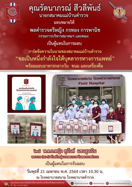 คุณรัตนาภรณ์ สีวลีพันธ์ นายกสมาคมแม่บ้านตำรวจ และคณะ ส่งการ์ดพร้อมข้อความในนามของสมาคมแม่บ้านตำรวจ ขอเป็นหนึ่งกำลังใจมอบให้บุคลากรทางการแพทย์ และขอบคุณจากหัวใจ เราจะผ่านช่วงเวลาที่ยากลำบากนี้ไปด้วยกัน พร้อมอาหารกลางวัน ขนม และเครื่องดื่ม ตลอดทั้งอาทิตย์ เพื่อเป็นกำลังใจให้กับทีม แพทย์ พยาบาล พร้อมทั้งเจ้าหน้าที่โรงพยาบาลตำรวจ โดยมีพลตำรวจตรีหญิง กรทอง การพานิช กรรมการบริหารสมาคมฯ คุณพิกุลอรุณ พิชิตชัยศิริ เลขานุการสมาคมฯ คุณอังคณา ปรักกมะกุล เหรัญญิกสมาคมฯ เละคณะเป็นผู้แทนในการมอบ ณ โรงพยาบาลภาคสนาม โรงพยาบาลตำรวจ