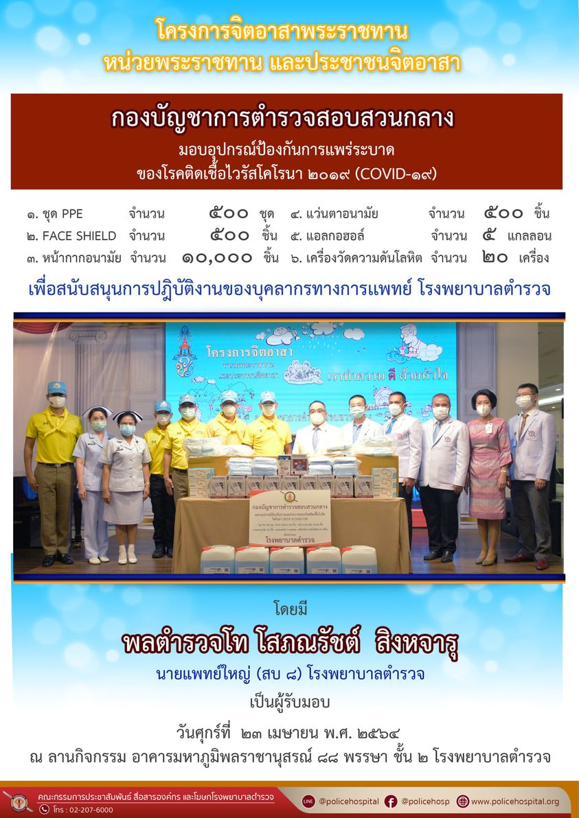 เมื่อวันศุกร์ที่ 23 เมษายน พ.ศ. 2564 พลตำรวจโท ต่อศักดิ์ สุขวิมล ผู้บัญชาการตำรวจสอบสวนกลาง มอบหมายให้พลตำรวจตรี วรวัฒน์ วัฒน์นครบัญชา รองบัญชาการตำรวจสอบสวนกลาง พร้อมกำลังพลจิตอาสาในสังกัดกองบัญชาการตำรวจสอบสวนกลาง มอบอุปกรณ์ป้องกันการแพร่ระบาดของไวรัสโคโรนา 2019 (COVID-19) เพื่อสนับสนุนบุคลากรทางการแพทย์โรงพยาบาลตำรวจในการช่วยเหลือประชาชน โดยมี พลตำรวจโท โสภณรัชต์ สิงหจารุ นายแพทย์ใหญ่(สบ 8)โรงพยาบาลตำรวจ และคณะเป็นผู้รับมอบ