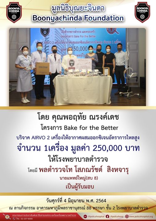 เมื่อวันพฤหัสบดีที่ 20 พฤษภาคม พ.ศ. 2564 คุณพอฤทัย ณรงค์เดช เเละคณะในนาม มูลนิธิบุณยะจินดา เพื่อข้าราชการตำรวจ และครอบครัว ภายใต้โครงการ Bake for the Better บริจาค Airvo เครื่องให้อากาศผสมออกซิเจนอัตราการไหลสูง จำนวน 1 เครื่อง มูลค่า 250,000 บาท เพื่อให้บุคลากรทางการแพทย์นำไปใช้ในการปฏิบัติงานในสถานการณ์การแพร่ระบาดของโควิด-19 โดยมี พลตำรวจโท โสภณรัชต์ สิงหจารุ นายแพทย์ใหญ่(สบ8) และคณะเป็นผู้รับมอบ