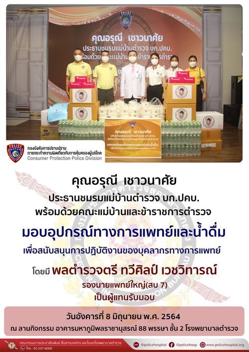 เมื่อวันอังคารที่ 8 มิถุนายน พ.ศ. 2564 คุณอรุณี เชาวนาศัย ประธานชมรมแม่บ้านตำรวจกองบังคับการปราบปรามการกระทำความผิดเกี่ยวกับการคุ้มครองผู้บริโภค พร้อมด้วยคณะแม่บ้านและข้าราชการตำรวจ มอบอุปกรณ์ทางแพทย์และน้ำดื่ม เพื่อสนับสนุนการปฏิบัติงานของบุคลากรทางการแพทย์ โดยมี พลตำรวจตรี ทวีศิลป์ เวชวิทารณ์ รองนายแพทย์ใหญ่(สบ 7) เป็นผู้แทนรับมอบ