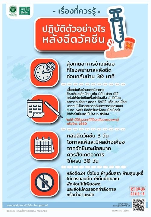 ปฏิบัติตัวอย่างไรหลังฉีดวัคซีนโควิด โดยโรงพยาบาลตำรวจบริการฉีดวัคซีนป้องกันโควิด 19 ตั้งเเต่วันที่ 7-30 มิถุนายน พ.ศ. 2564 เวลา 08.00-15.00 น. ณ อาคารมหาภูมิพลราชานุสรณ์ 88 พรรษา โรงพยาบาลตำรวจ ขอขอบคุณข้อมูลและภาพจากศูนย์สื่อสารสาธารณะ กรมอนามัย กระทรวงสาธารณสุข