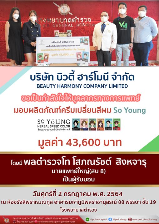 เนื้อหาข่าว : ดูตัวอย่างข่าว เมื่อวันศุกร์ที่ 2 กรกฎาคม พ.ศ. 2564 บริษัท บิวตี้ ฮาร์โมนี จำกัด มอบผลิตภัณฑ์ครีมเปลี่ยนสีผม So Young มูลค่า 43,600 บาท เพื่อเป็นกำลังใจให้บุคลากรทางการแพทย์ โดยมี พลตำรวจโท โสภณรัชต์ สิงหจารุ นายแพทย์ใหญ่(สบ8) และเป็นผู้รับมอบ
