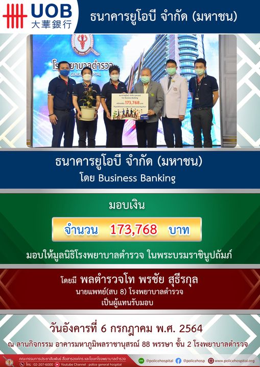 เมื่อวันอังคารที่ 6 กรกฎาคม พ.ศ. 2564 ธนาคารยูโอบี จำกัด (มหาชน) โดย Business Banking มอบเงินบริจาค 173,768 บาท แก่มูลนิธิโรงพยาบาลตำรวจ ในพระบรมราชินูปถัมภ์ โดยมี พลตำรวจโท พรชัย สุธีรกุล นายแพทย์(สบ 8)โรงพยาบาลตำรวจ และ พลตำรวจตรี ทรงชัย สิมะโรจน์ กรรมการและเหรัญญิก มูลนิธิโรงพยาบาลตำรวจ ในพระบรมราชินูปถัมภ์ เป็นผู้แทนรับมอบ
