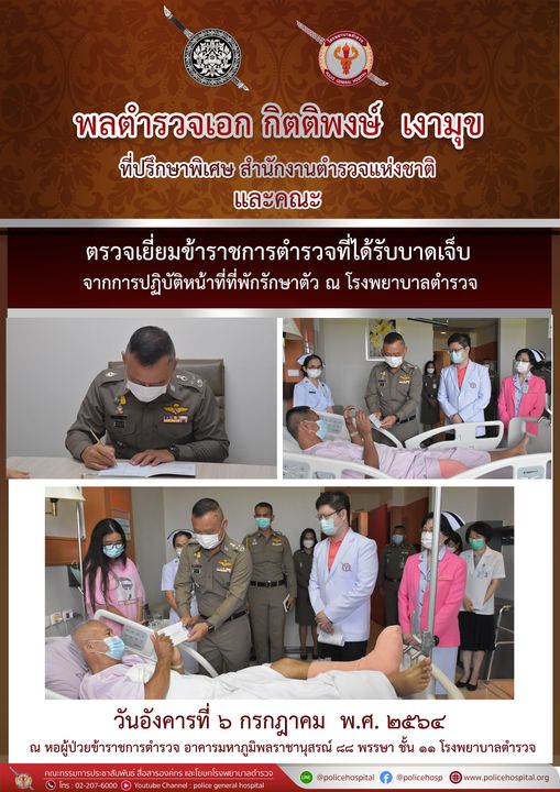 เมื่อวันอังคารที่ 6 กรกฎาคม พ.ศ. 2564 พลตำรวจเอก กิตติพงษ์ เงามุข ที่ปรึกษาพิเศษ สำนักงานตำรวจแห่งชาติ และคณะ เป็นผู้แทนสำนักงานตำรวจแห่งชาติตรวจเยี่ยมบำรุงขวัญข้าราชการตำรวจที่ได้รับบาดเจ็บจากการปฏิบัติหน้าที่ โดยมี พันตำรวจโท เอกพล ตั้งมานะสกุล นายแพทย์(สบ 3) กลุ่มงานออร์โธปิดิกส์ และคณะให้การต้อนรับ