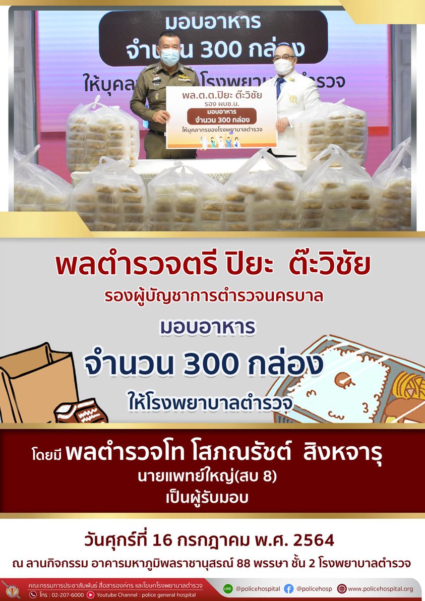 เมื่อวันศุกร์ที่ 16 กรกฎาคม พ.ศ. 2564 พลตำรวจตรี ปิยะ ต๊ะวิชัย รองผู้บัญชาการตำรวจนครบาล มอบอาหาร จำนวน 300 กล่อง ให้แก่โรงพยาบาลตำรวจ เพื่อเป็นกำลังใจให้บุคลากรทางการแพทย์โรงพยาบาลตำรวจ โดยมี พลตำรวจโท โสภณรัชต์ สิงหจารุ นายแพทย์ใหญ่(สบ8) เป็นผู้รับมอบ