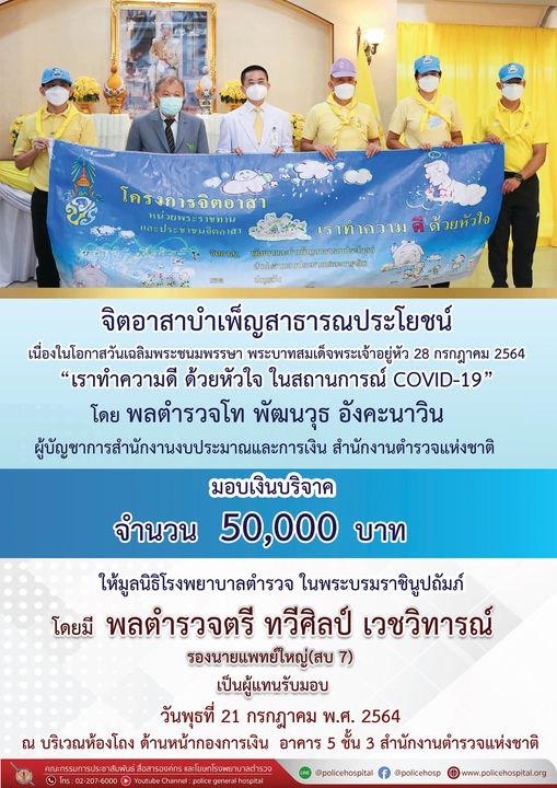 เมื่อวันพุธที่ 21 กรกฎาคม พ.ศ. 2564 พลตำรวจโท พัฒนวุธ อังคะนาวิน ผู้บัญชาการสำนักงานงบประมาณและการเงิน สำนักงานตำรวจแห่งชาติ มอบเงินบริจาค 50,000 บาท ให้มูลนิธิโรงพยาบาลตำรวจ ในพระบรมราชินูปถัมภ์ โดยมี พลตำรวจตรี ทวีศิลป์ เวชวิทารณ์ รองนายแพทย์ใหญ่(สบ 7) และคณะเป็นผู้แทนรับมอบ