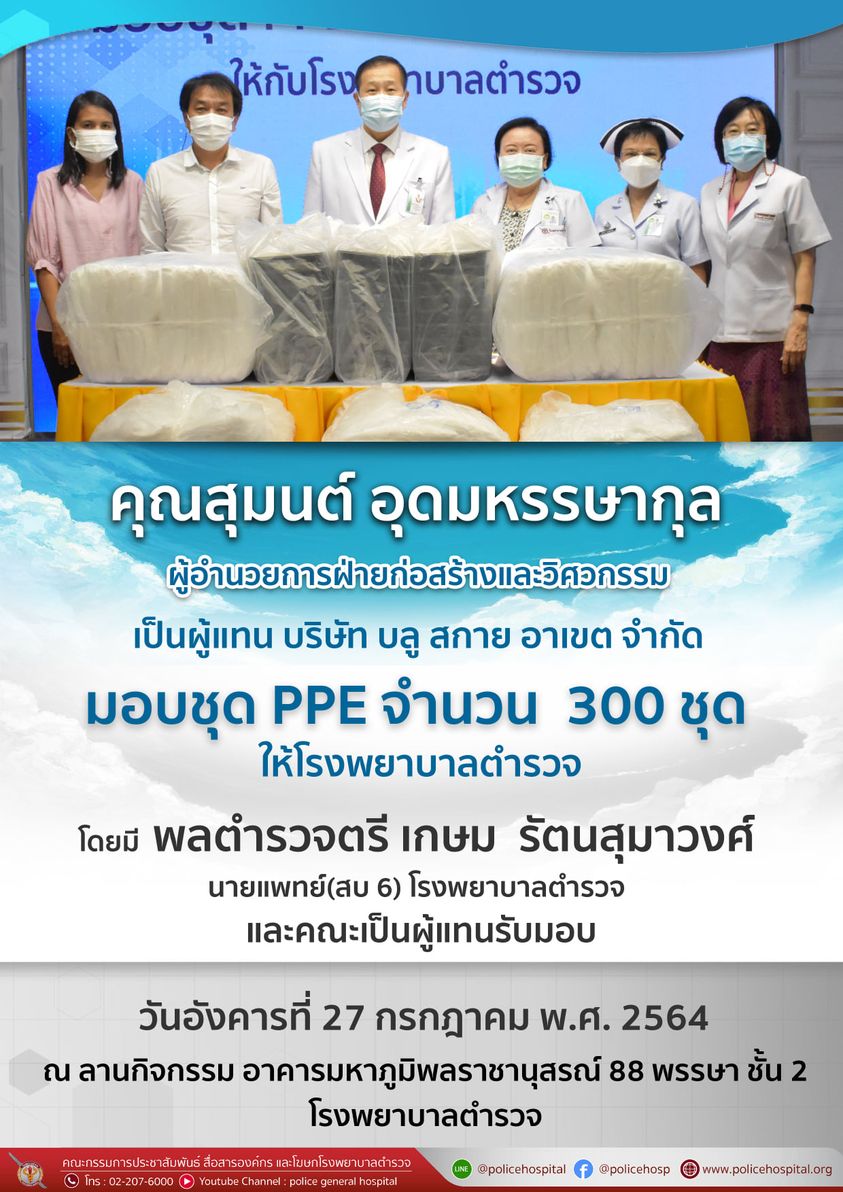 เมื่อวันอังคารที่ 27 กรกฎาคม พ.ศ. 2564 คุณสุมนต์ อุดมหรรษากุล ผู้อำนายการฝ่ายก่อสร้างและวิศวกรรม เป็นผู้แทนบริษัท บลู สกาย อาเขต จำกัด มอบชุด PPE จำนวน 300 ชุด ให้โรงพยาบาลตำรวจ โดยมี พลตำรวจตรี เกษม รัตนสุมาวงศ์ นายแพทย์(สบ 6) โรงพยาบาลตำรวจ และคณะเป็นผู้แทนรับมอบ