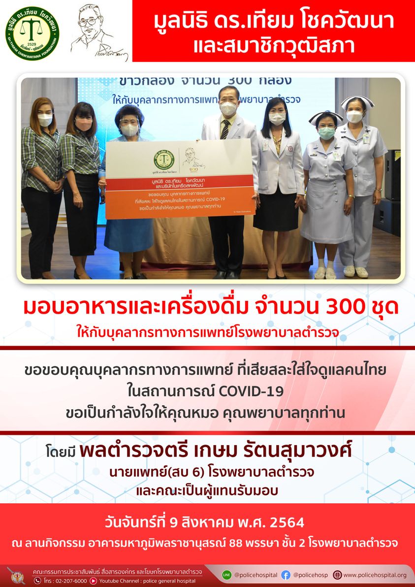 เมื่อวันจันทร์ที่ 9 สิงหาคม พ.ศ. 2564 มูลนิธิ ดร.เทียม โชควัฒนา และสมาชิกวุฒิสภา มอบอาหารและเครื่องดื่ม จำนวนเงิน 300 ชุด ให้แก่บุคลากรทางการแพทย์โรงพยาบาลตำรวจ เพื่อขอบคุณและให้กำลังใจบุคลากรทางการแพทย์ ที่เสียสละใส่ใจดูแลคนไทยในสถานการณ์ COVID-19 โดยมี พลตำรวจตรี เกษม รัตนสุมาวงศ์ นายแพทย์(สบ 6) โรงพยาบาลตำรวจ และคณะเป็นผู้แทนรับมอบ
