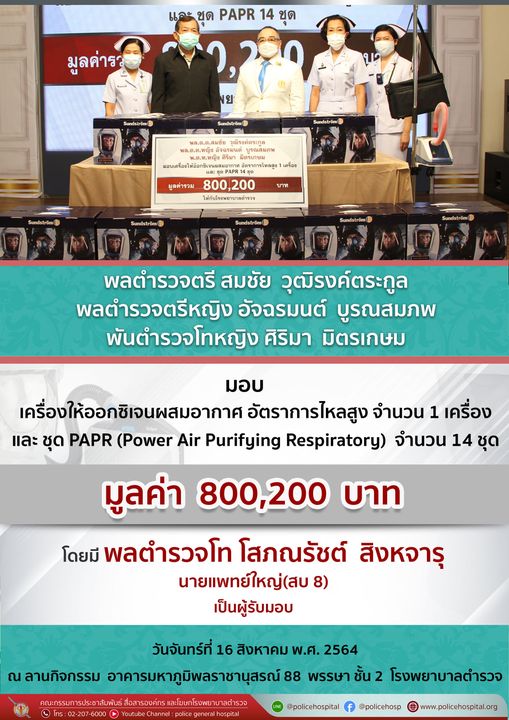 (Power Air Purifying Respiratory) จำนวน 14 ชุด มูลค่า 800,200 บาท โดยมี พลตำรวจโท โสภณรัชต์ สิงหจารุ นายแพทย์ใหญ่(สบ8) เป็นผู้รับมอบ