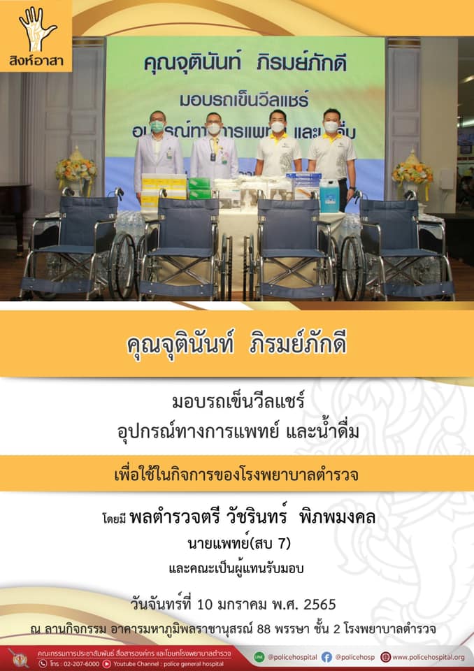 เมื่อวันจันทร์ที่ 10 มกราคม พ.ศ. 2565 คุณจุตินันท์ ภิรมย์ภักดี มอบรถเข็นวีลแชร์ อุปกรณ์ทางการแพทย์และน้ำดื่ม ให้โรงพยาบาลตำรวจ โดยมี พลตำรวจตรี วัชรินทร์ พิภพมงคล นายแพทย์(สบ 7) เป็นผู้แทนรับมอบ ณ ลานกิจกรรม อาคารมหาภูมิพลราชานุสรณ์ 88 พรรษา ชั้น 2 โรงพยาบาลตำรวจ