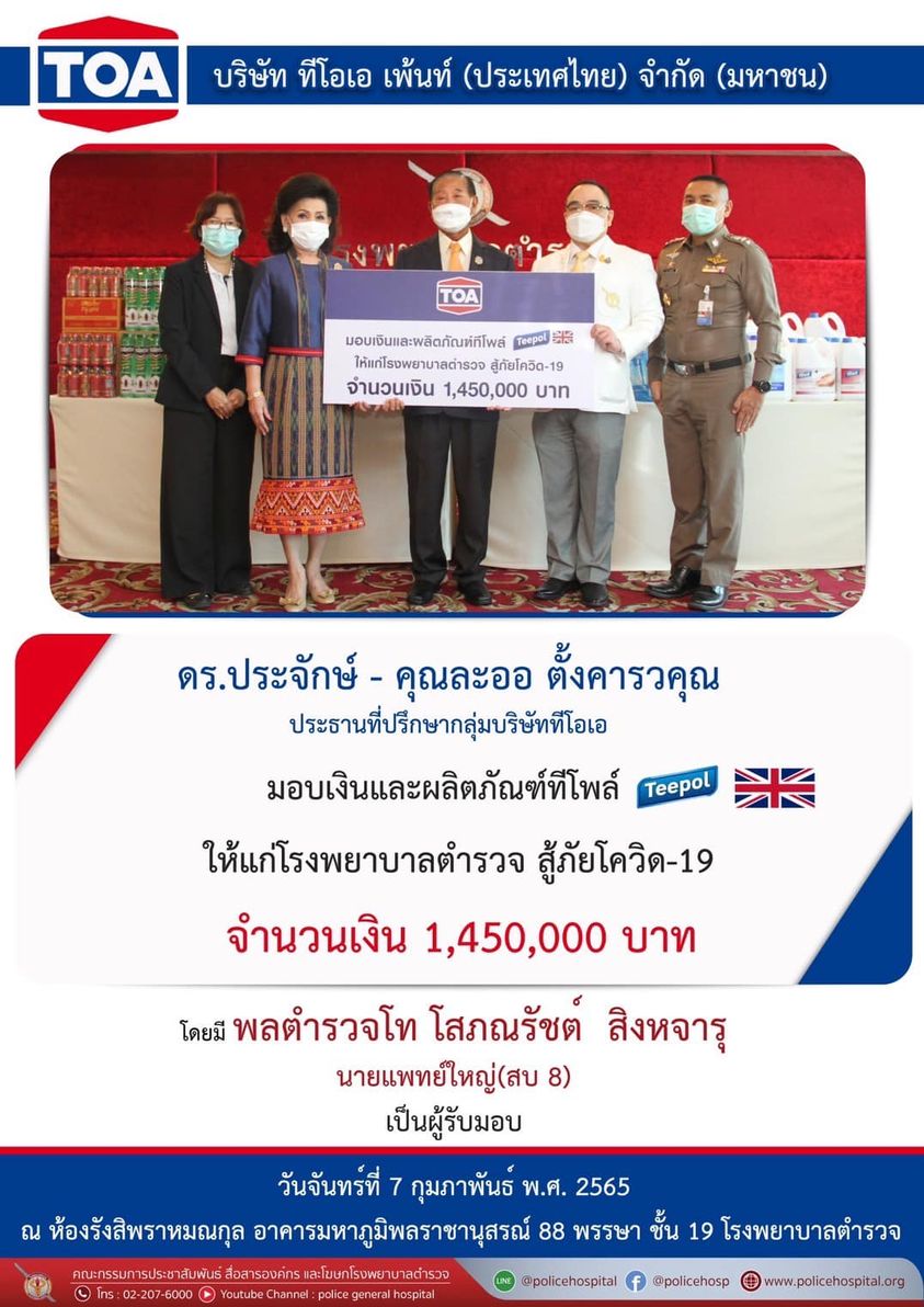 เมื่อวันจันทร์ที่ 7 กุมภาพันธ์ พ.ศ. 2565 บริษัท ทีโอเอ เพ้นท์ (ประเทศไทย) จำกัด (มหาชน) โดย ดอกเตอร์ ประจักษ์ ตั้งคารวคุณ พร้อมด้วย คุณละออ ตั้งคารวคุณ ประธานที่ปรึกษากลุ่มบริษัท ทีโอเอ จำกัด มอบเงินและผลิตภัณฑ์ทีโพลล์ มูลค่า 1,450,000 บาท ให้โรงพยาบาลตำรวจ สู้ภัยโควิด-19 โดยมี พลตำรวจโท โสภณรัชต์ สิงหจารุ นายแพทย์ใหญ่(สบ8) เป็นผู้รับมอบ ณ ห้องรังสิพราหมณกุล อาคารมหาภูมิพลราชานุสรณ์ 88 พรรษา ชั้น 19 โรงพยาบาลตำรวจ