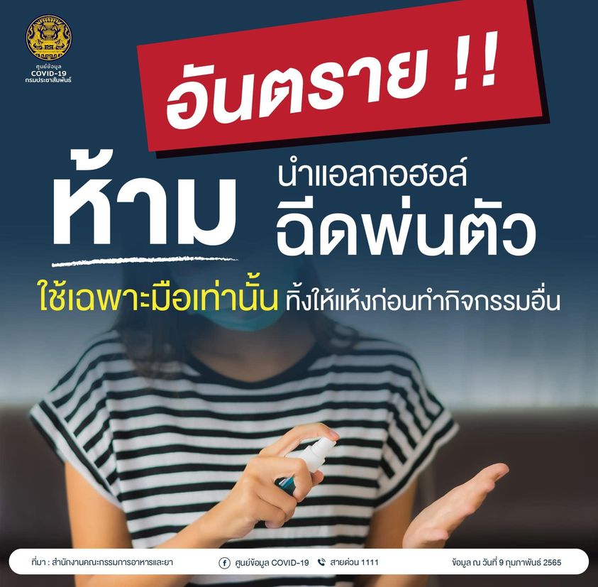 องค์การอาหารและยา เตือนผู้บริโภค ระวังการใช้ แอลกอฮอล์เพื่อสุขอนามัยสำหรับมือ หรือแอลกอฮอล์สเปรย์ อย่านำมาฉีดพ่นบนร่างกายเด็ดขาด เพราะมีส่วนผสมของแอลกอฮอล์ ที่มีความเข้มข้นสูง แนะให้ใช้เฉพาะมือเท่านั้น ถูให้ทั่วมือ ไม่น้อยกว่า 20 วินาที ควรทิ้งให้แห้งเพื่อให้แอลกอฮอล์ระเหยก่อนจะทำกิจกรรมอื่น เก็บให้พ้นมือเด็กเล็ก อาบน้ำ สระผมทันทีเมื่อกลับถึงบ้าน เพื่อความปลอดภัย