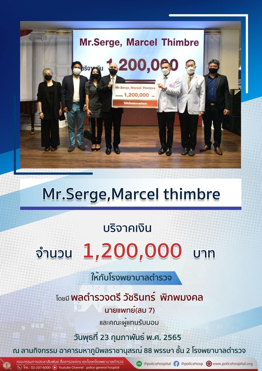 เมื่อวันพุธที่ 23 กุมภาพันธ์ พ.ศ. 2564 Mr.Serge, Marcel Thimbre บริจาคเงิน 1,200,000 บาท ให้โรงพยาบาลตำรวจ โดยมี พลตำรวจตรี วัชรินทร์ พิภพมงคล นายแพทย์(สบ 7) และคณะเป็นผู้แทนรับมอบ ณ ลานกิจกรรม อาคารมหาภูมิพลราชานุสรณ์ 88 พรรษา ชั้น 2 โรงพยาบาลตำรวจ